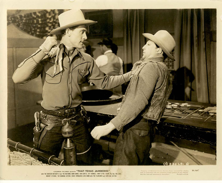 Singing in a swing band provided his entrance to entertainment, but Ken Curtis soon switched to acting in films. Among his many film credits are Mister Roberts, The Alamo, Cheyenne Autumn, and others. He gained fame as Festus Haggen on television's Gunsmoke beginning in 1964-1975. Curtis was born in 1916 and died in 1991. The photograph shows a very young Curtis in the Western That Texas Jamboree. Also included is his uncommon signature dated June 24, 1989, on a heavy 5" x 3" card stock. Fine.