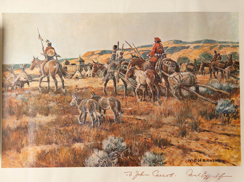 Colorful print of Indians on horse-back traveling to a distant military fort for treaty talks. Signed by Nick Eggenhofer. Some light wrinkles, else fine copy. Suitable for framing.