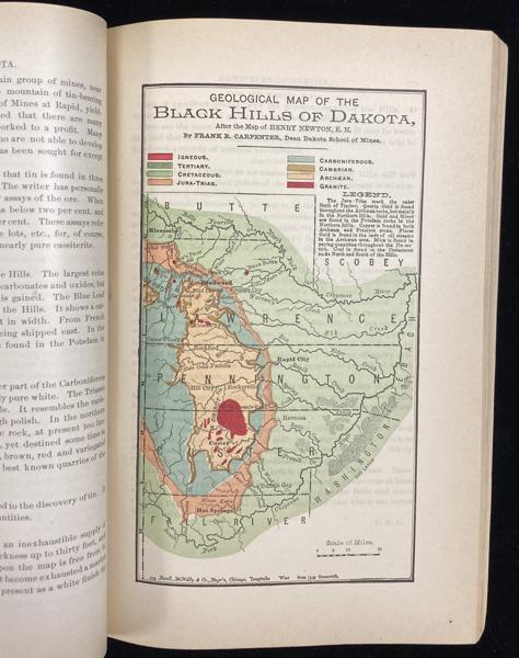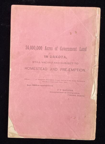 First edition. 8vo. Printed wrappers, frontispiece of the territorial capitol in Bismarck; 498 pp; 2 colored maps; many illustrations of buildings throughout the territory; index. Printed in Sioux Falls, Dakota, by Argus-Leader Company, Printers, 1887. At the time of the publication, P. F. McClure was the Commissioner of the Department of Immigration and Statistics. The back cover has a message printed on it from McClure requesting that anyone interested in "24,000,000 Acres of Government Land in Dakota, Still Vacant and Subject to Homestead and Pre-Emption” should request “Pamphlets of every Section of the Great Territory – The Government Land Law, Etc." The long sub-title is a good summary of the contents of this publication which was produced to encourage settlement into the Dakotas in the late 19th century. The completion of a railroad system in the 1880s going east and west was a major incentive for introducing the potential of the Dakotas to potential immigrants. Scarce on the market, this booklet is a major source of information about the development of the Dakota Territory, and eventually the states of North and South Dakota. The back cover has separated from the booklet, but is present; the spine and front cover are chipped around the edges. The text block is tight and in very good condition.
