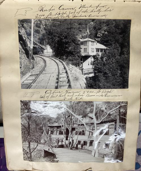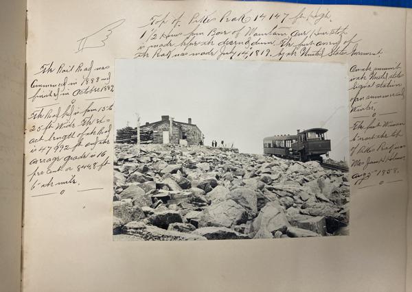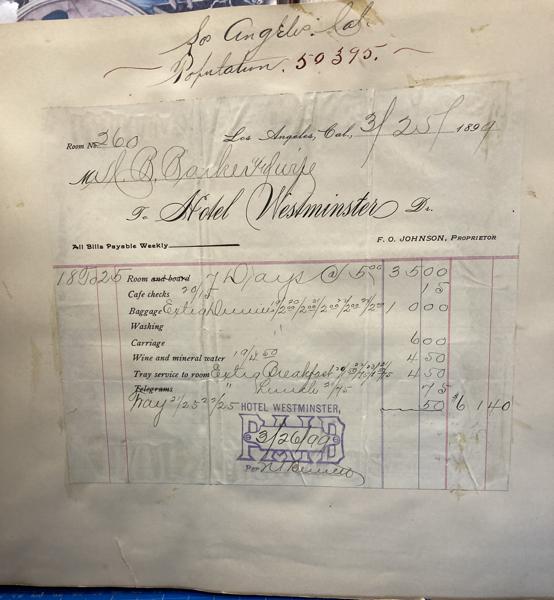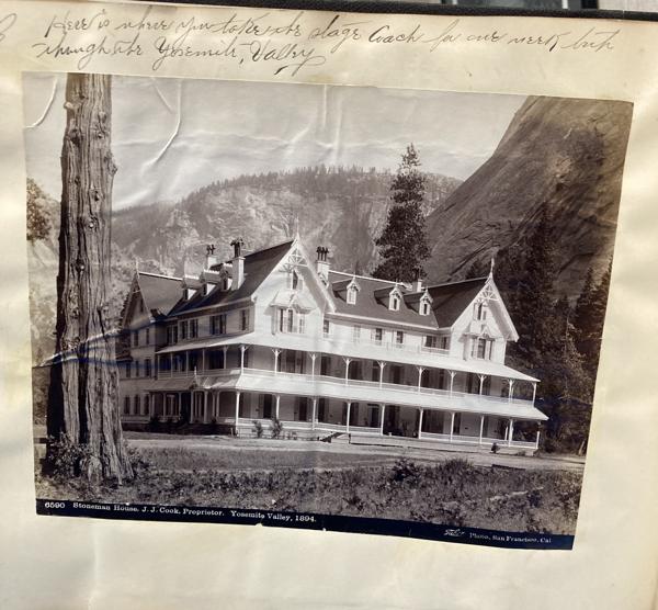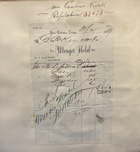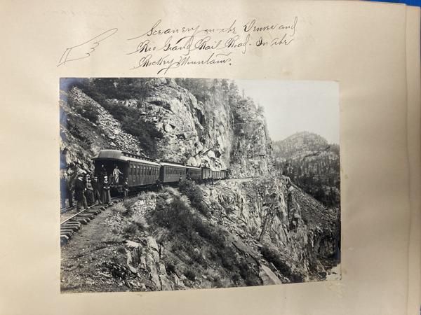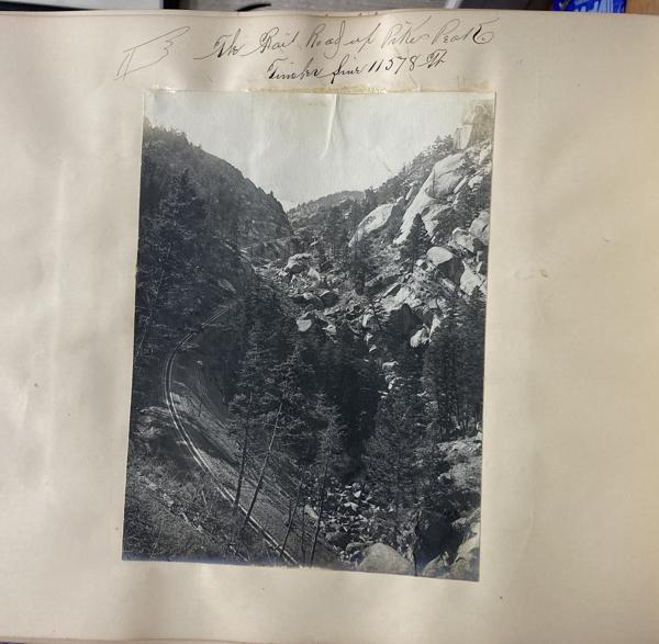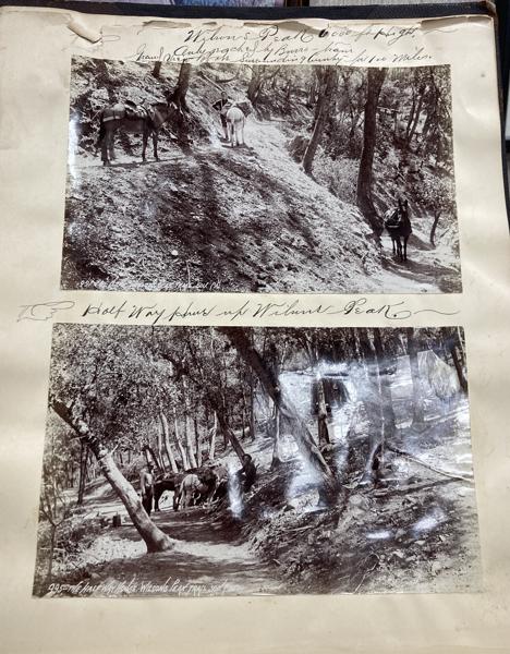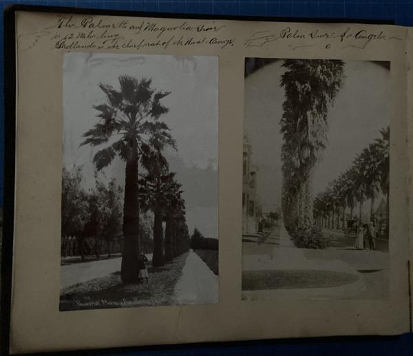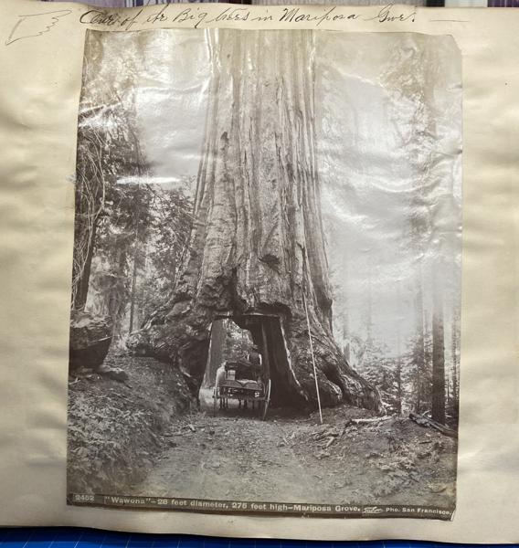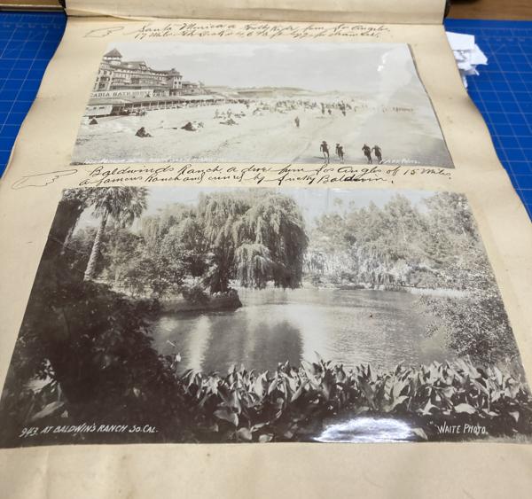 11 x 13 1/2" x 1 1/2," bound in brown heavy pebble-surface cloth, leather corners & spine, with gilt line-and-scroll rules. With the 'title' in three paper strips affixed to the top cover: "Book IIII - Tour of 1899 - From the Atlantic to the Pacific." Houses 84 photographs, mostly via studios including 11 by Parker & Co., 1 by Waite, 21 by Taber, 5 by C.R. Savage, 14 by F.P. Stevens as well as several Cyanotype prints. The album consists of photographs and supporting ephemeral paper related to the journey. All photographs and ephemeral items are pasted directly to pages and each has hand-written description of location and most with brief information. Through research, we have determined that the album most likely belonged to Charles Bell Barker and his wife. C.B. Barker Manufacturing Co./Barker Silver Co. specialized in silverware and was located in New York, New York, from around 1895-1900 and then in Milford, Connecticut, from around 1900-1901. Photographs in this album include: Parker & Co. Photo, (11), with their studio name & title of image in the print; photos are approx. 5" x 8" size, including: # 710 Palmettos, Magnolia Ave. Riverside Cal.; # 299.A. Palm Drive Avenue; Palmetto Palm (faded); # 744 Date Palm Los Angeles Cal.; # 906 Canyon Crest Park (faded); # 912 The Arrowhead Hot Springs Hotel; #1621 Arcadia Hotel Beach Santa Monica; # 650 Mount Lowe view (railway, observatory, hotel in distance); # 605 Alpine Tavern Mount Lowe Railway; # 991 The Oaks at (head) of the (burro) Trail Sou. Cal.; # 995 The Half Way House Wilson’s Peak Trail Sou. Cal. Waite (1861-1927) Photo (1), with their studio name & title of image in the print; photos are approx. 5" x 8" size, including: # 943 At Baldwin's Ranch So. Cal. Charles Betts Waite (1861-1927) "…Active in Escondido and San Diego area in 1891, working with H. E. Coonley before moving to Los Angeles and Mexico. Brother of San Diego Sun editor Frank D. Waite." Unknown (2): Cable car incline Echo Mountain; (and another) Ruffin Canyon cable car route. (May also be Waite studio) Taber Photo, San Francisco (21), with their studio name & title of image in the print; photos are approx. 7 1/2" x 9 1/2" size, including: # 8785 Seal Rocks, S.F. Cal.; # 7879 Japanese Garden, Golden Gate Park; # 7903 Huntington Falls, Golden Gate Park; # 2490 Study on Pescadero Creek – Redwood Cal.; # 5116 Wawona Hotel A.D. 1890 (faded a little); # 2452 "Wawona" 26 feet diameter…Mariposa Grove; # 5897 Hotel Vendome, San Jose Cal.; # 5874 Lick Observatory road, Half way up Mt. Hamilton; # 4780 General View Lick Observatory, San Jose; # 4480 Hotel Del Monte – front-Monterey Cal.; # 324 Arizona Garden, "Hotel del Monte" Monterey; # 4495 The grounds of the hotel; # B 292 Cypress Drive, near Midway Point; # B 271 Cypress Tree, near Cypress Drive; # 2516 Cal. ... A Study (album notes this was seen "On the Road to Santa Cruz, on the side of the Rail Road;" # 5907 Big Trees Santa Cruz (3); # 6590 Stoneman House, J.J. Cook, Proprietor Yosemite Valley, 1894; # 6999 Yosemite Stage Coach, April 1895; # 6990 General View of the Yosemite Valley from Glacier Point, Yosemite Valley, April. Isaiah West Taber (1830-1912) "…When Watkins lost his studio and negatives to creditor John J. Cook. Cook, along with photographer I. W. Taber, took over the Yosemite Art Gallery.…In the 1906 at the time of the S.F. Earthquake he was 76, lost his gallery and negative collection, that was the end of his photographic career." Unknown. Photograph of a drawing of the bathing pavilion on the Great Salt Lake UT, (the first 'Saltair' resort) approx. 6" x 8." C.R. Savage Photo (5), with their studio name & title of image in the print; photos are approx. 5 3/4" x 8" size, including: Mormon Temple, Salt Lake; Interior of Mormon Tabernacle; Eagle Gate erected by B. Young; Gardo House…erected by Brigham Young; (portrait) Brigham Young. C.R. (Charles Roscoe) Savage (1832-1909) "… one of the foremost 19th century landscape photographers of the western United States, as well as a renowned studio portrait photographer, with his studio in Salt Lake City, Utah…" F.P. Stevens (14), with their studio name & title of image in the print; photos are approx. 6" x 8" size, including: Rain in Manitou, Col; Railroad up Pike's Peak; View of Mountain rail road; view of the Valley of Manitou from RR; Half Way house "stop of ten minutes is made for water;" Nearing the top Pike's Peak; Top of Pike's (This page with a few paragraphs of historical touring information); Burro-portrait 'the only way up;' Scenery along the Denver & Rio Grande RR in the Rocky Mountains; Colorado & Midland RR scenery; # 601. Pike’s Peak Ave. Colorado Springs; North Cheyenne Canyon; Seven Falls; South Cheyenne Canyon. (Note: these images are very finely detailed silver prints; only slight silvering on some borders) Fred Park Stevens (1872 - 1915) Photographic reproduction process inventor and "The Man that Made Colorado Famous." The Stevens-identified section is followed by (6) additional photos, in the same size format and albumen process; we speculate that they may also by Stevens’ studio images: Sentinel Rock Garden of the Gods Col. Springs; Balance Rock; Seven Falls; Giant Gate Way entrance; Seal & Turtle Rocks; and the Devil's Punch Bowl. Photographs followed by 24 detailed hotel-bill receipts for the travelers, from The Arlington, Washington DC; The Jefferson, Richmond VA; Charleston Hotel, Charleston SC; The De Soto, Savannah GA; The St. James, Jacksonville, FL; Hotel Ponce de Leon, St. Augustine, FL; Battle House Co., Mobile AL; Hotel Grunewald, New Orleans LA; Tremont Hotel, Galveston TX; Capitol Hotel, Houston TX; The Driskill Hotel, Austin TX; Menger Hotel, San Antonio TX; Hotel Westminster, Los Angeles, CA; Echo Mountain House, CA; Hotel del Coronado, Coronado Beach, CA; Hotel Florence, San Diego, CA; Place Hotel, San Francisco CA; Hotel Del Monte, Monterey, CA; Hotel Vendome, San Jose, CA; Golden Eagle Hotel, Sacrame