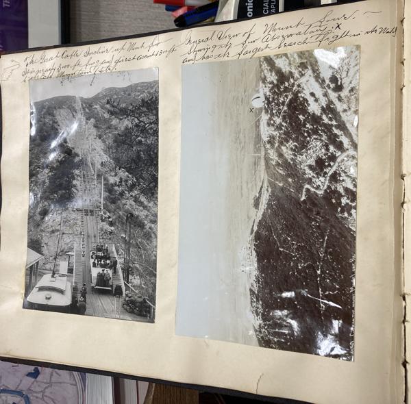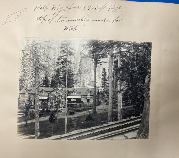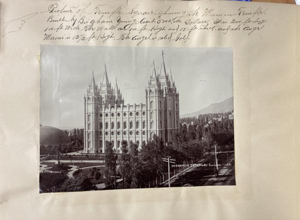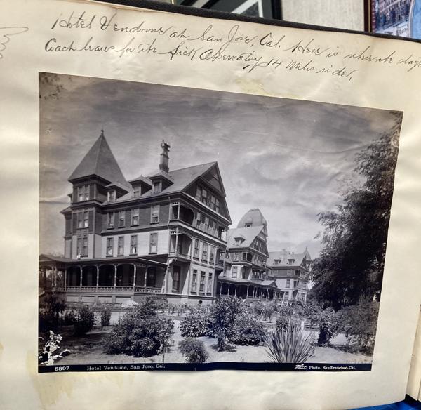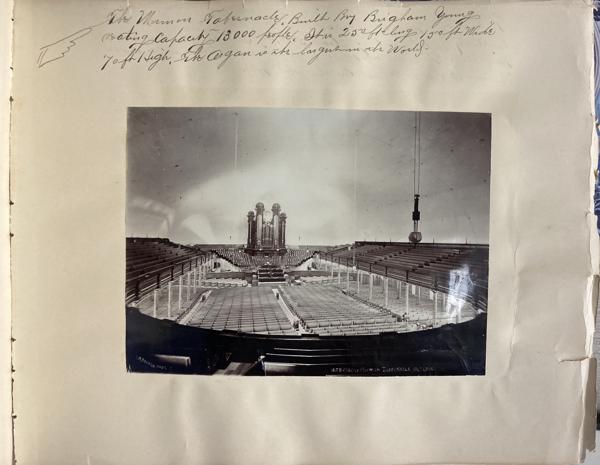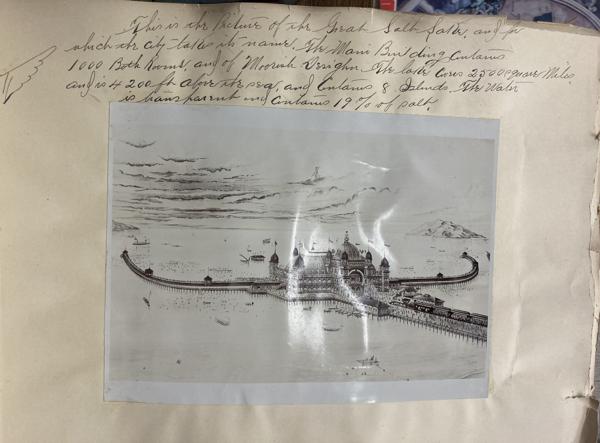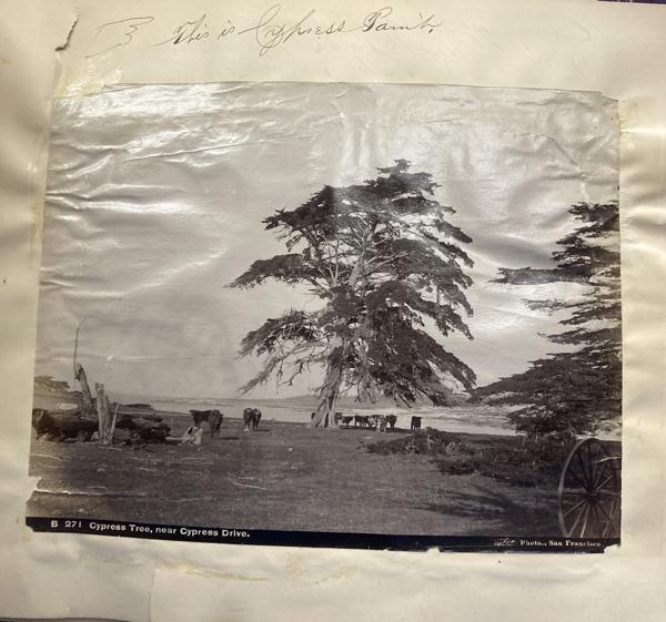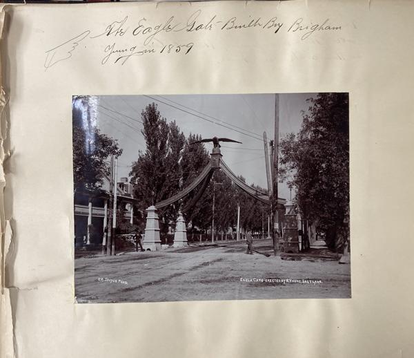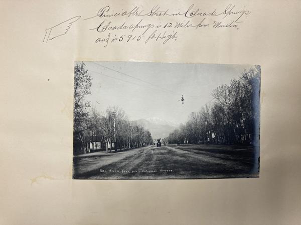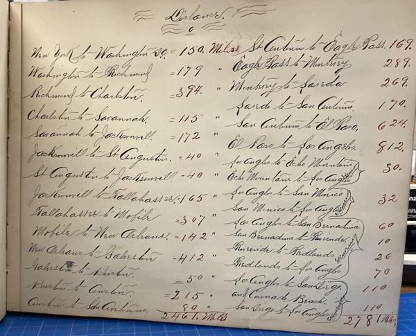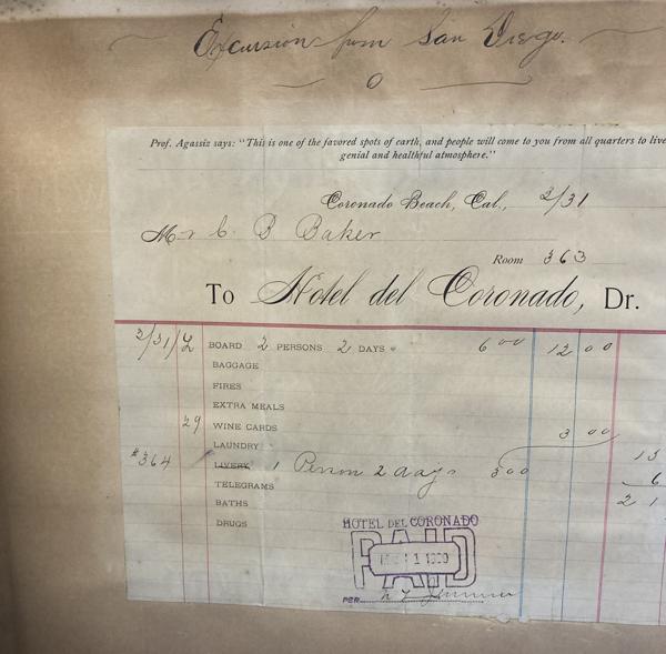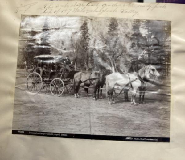 11 x 13 1/2" x 1 1/2," bound in brown heavy pebble-surface cloth, leather corners & spine, with gilt line-and-scroll rules. With the 'title' in three paper strips affixed to the top cover: "Book IIII - Tour of 1899 - From the Atlantic to the Pacific." Houses 84 photographs, mostly via studios including 11 by Parker & Co., 1 by Waite, 21 by Taber, 5 by C.R. Savage, 14 by F.P. Stevens as well as several Cyanotype prints. The album consists of photographs and supporting ephemeral paper related to the journey. All photographs and ephemeral items are pasted directly to pages and each has hand-written description of location and most with brief information. Through research, we have determined that the album most likely belonged to Charles Bell Barker and his wife. C.B. Barker Manufacturing Co./Barker Silver Co. specialized in silverware and was located in New York, New York, from around 1895-1900 and then in Milford, Connecticut, from around 1900-1901. Photographs in this album include: Parker & Co. Photo, (11), with their studio name & title of image in the print; photos are approx. 5" x 8" size, including: # 710 Palmettos, Magnolia Ave. Riverside Cal.; # 299.A. Palm Drive Avenue; Palmetto Palm (faded); # 744 Date Palm Los Angeles Cal.; # 906 Canyon Crest Park (faded); # 912 The Arrowhead Hot Springs Hotel; #1621 Arcadia Hotel Beach Santa Monica; # 650 Mount Lowe view (railway, observatory, hotel in distance); # 605 Alpine Tavern Mount Lowe Railway; # 991 The Oaks at (head) of the (burro) Trail Sou. Cal.; # 995 The Half Way House Wilson’s Peak Trail Sou. Cal. Waite (1861-1927) Photo (1), with their studio name & title of image in the print; photos are approx. 5" x 8" size, including: # 943 At Baldwin's Ranch So. Cal. Charles Betts Waite (1861-1927) "…Active in Escondido and San Diego area in 1891, working with H. E. Coonley before moving to Los Angeles and Mexico. Brother of San Diego Sun editor Frank D. Waite." Unknown (2): Cable car incline Echo Mountain; (and another) Ruffin Canyon cable car route. (May also be Waite studio) Taber Photo, San Francisco (21), with their studio name & title of image in the print; photos are approx. 7 1/2" x 9 1/2" size, including: # 8785 Seal Rocks, S.F. Cal.; # 7879 Japanese Garden, Golden Gate Park; # 7903 Huntington Falls, Golden Gate Park; # 2490 Study on Pescadero Creek – Redwood Cal.; # 5116 Wawona Hotel A.D. 1890 (faded a little); # 2452 "Wawona" 26 feet diameter…Mariposa Grove; # 5897 Hotel Vendome, San Jose Cal.; # 5874 Lick Observatory road, Half way up Mt. Hamilton; # 4780 General View Lick Observatory, San Jose; # 4480 Hotel Del Monte – front-Monterey Cal.; # 324 Arizona Garden, "Hotel del Monte" Monterey; # 4495 The grounds of the hotel; # B 292 Cypress Drive, near Midway Point; # B 271 Cypress Tree, near Cypress Drive; # 2516 Cal. ... A Study (album notes this was seen "On the Road to Santa Cruz, on the side of the Rail Road;" # 5907 Big Trees Santa Cruz (3); # 6590 Stoneman House, J.J. Cook, Proprietor Yosemite Valley, 1894; # 6999 Yosemite Stage Coach, April 1895; # 6990 General View of the Yosemite Valley from Glacier Point, Yosemite Valley, April. Isaiah West Taber (1830-1912) "…When Watkins lost his studio and negatives to creditor John J. Cook. Cook, along with photographer I. W. Taber, took over the Yosemite Art Gallery.…In the 1906 at the time of the S.F. Earthquake he was 76, lost his gallery and negative collection, that was the end of his photographic career." Unknown. Photograph of a drawing of the bathing pavilion on the Great Salt Lake UT, (the first 'Saltair' resort) approx. 6" x 8." C.R. Savage Photo (5), with their studio name & title of image in the print; photos are approx. 5 3/4" x 8" size, including: Mormon Temple, Salt Lake; Interior of Mormon Tabernacle; Eagle Gate erected by B. Young; Gardo House…erected by Brigham Young; (portrait) Brigham Young. C.R. (Charles Roscoe) Savage (1832-1909) "… one of the foremost 19th century landscape photographers of the western United States, as well as a renowned studio portrait photographer, with his studio in Salt Lake City, Utah…" F.P. Stevens (14), with their studio name & title of image in the print; photos are approx. 6" x 8" size, including: Rain in Manitou, Col; Railroad up Pike's Peak; View of Mountain rail road; view of the Valley of Manitou from RR; Half Way house "stop of ten minutes is made for water;" Nearing the top Pike's Peak; Top of Pike's (This page with a few paragraphs of historical touring information); Burro-portrait 'the only way up;' Scenery along the Denver & Rio Grande RR in the Rocky Mountains; Colorado & Midland RR scenery; # 601. Pike’s Peak Ave. Colorado Springs; North Cheyenne Canyon; Seven Falls; South Cheyenne Canyon. (Note: these images are very finely detailed silver prints; only slight silvering on some borders) Fred Park Stevens (1872 - 1915) Photographic reproduction process inventor and "The Man that Made Colorado Famous." The Stevens-identified section is followed by (6) additional photos, in the same size format and albumen process; we speculate that they may also by Stevens’ studio images: Sentinel Rock Garden of the Gods Col. Springs; Balance Rock; Seven Falls; Giant Gate Way entrance; Seal & Turtle Rocks; and the Devil's Punch Bowl. Photographs followed by 24 detailed hotel-bill receipts for the travelers, from The Arlington, Washington DC; The Jefferson, Richmond VA; Charleston Hotel, Charleston SC; The De Soto, Savannah GA; The St. James, Jacksonville, FL; Hotel Ponce de Leon, St. Augustine, FL; Battle House Co., Mobile AL; Hotel Grunewald, New Orleans LA; Tremont Hotel, Galveston TX; Capitol Hotel, Houston TX; The Driskill Hotel, Austin TX; Menger Hotel, San Antonio TX; Hotel Westminster, Los Angeles, CA; Echo Mountain House, CA; Hotel del Coronado, Coronado Beach, CA; Hotel Florence, San Diego, CA; Place Hotel, San Francisco CA; Hotel Del Monte, Monterey, CA; Hotel Vendome, San Jose, CA; Golden Eagle Hotel, Sacrame