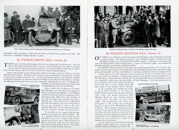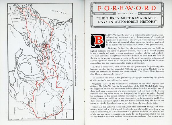 Original printed stapled wrappers, 32 pp., including a full-page map and illustrations from photographs. A rare account of an epic, early American automobile trip, covering much of the Midwest, Mid-Atlantic, and Northeast, and venturing as far west as Kansas and Nebraska. The Mitchell-Lewis Motor Company, based in Racine, only existed from 1903 to 1923, but it was an incredibly active two decades, with steady growth in production, vigorous marketing efforts, and participation in a number of distance driving contests to show the quality and reliability of their cars. The trip documented herein, in a 1915 Mitchell Light Four, began in Chicago on September 23, 1914. The drivers, William H. Halsey (of the Williams-Halsey Motor Car Company and an accomplished cross-country driver), Ray Barnett (who had previously driven a Mitchell Six a record distance without a stop), and Frank Zirbes (of the Mitchell Company, and the trip's navigator) were challenged to go as far as they could in a month, and covered 7500 miles, averaging 250 miles a day. The map shows the route taken by the car, as far north as Portland, Maine; down to Washington, D.C.; twice across the Midwest; and westward into Nebraska and Kansas. The first portion of the text gives a general overview of the journey, followed by a day-by-day account of the car's travels, including conditions that tested the car's cooling system, suspension, ability to cross muddy dirt roads, and other challenges. Profusely illustrated throughout with illustrations from photographs, showing the many cities visited, the car in front of Mitchell dealerships, stuck in mud in Kansas, traversing a primitive road in Missouri, and much more. As this journey only went about halfway across the country, it does not qualify for inclusion in Bliss's Autos Across America, though the total distance covered is certainly that of a trip from coast to coast and back. A bit of light sunning to the wrappers, else a near fine copy.