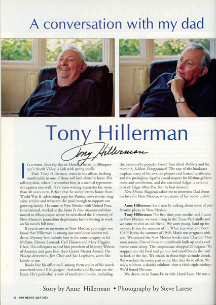 First edition. 4to. Story appears in July 2003 issue, July 2003, Vol. 81. No 7. Color pictorial wrappers, 104 pp., story appears on page 30 - 34, double column, illustrated, inked signature of Tony Hillerman. This is the magazine's lead article. Contains a number of color photographs of Hillerman by Steve Larese. A wonderful look at this legendary author by his daughter who is also an accomplished journalist. Also includes "Mountain Man Rendezvous" by Charlotte Berney. A fine copy.