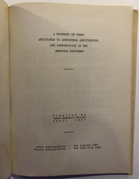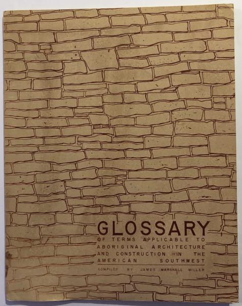 Reprint of the Second Mimeographing of 1943. Stiff Printed Wrappers. 19pp. Foreword. Bibliography. "The purpose of this Glossary is to present a compilation of a group of terms which may serve as a reference source for the student of southwestern archaeology in their study or description of the architectural and constructional features as evidenced in the various structures built by the Indians in the American Southwest." A detailed and thorough description of almost 200 terms used to describe the architecture and construction of the Indians. Dampstaining to 2"x4" area at base of spine and previous owners name on front endpaper, else Very Good. Scarce.