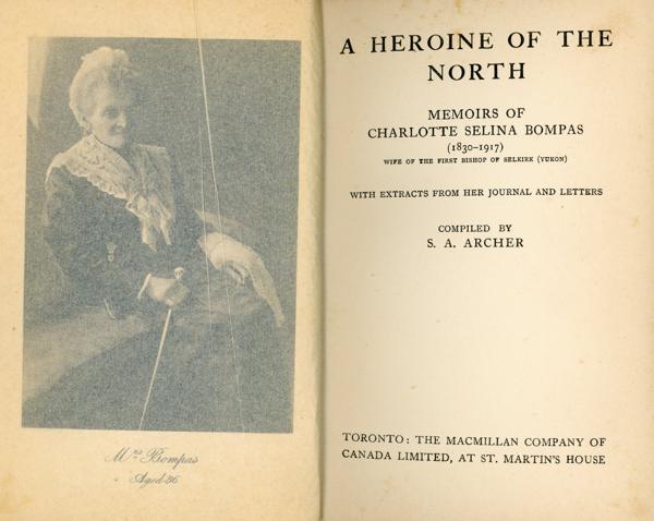First Canadian edition. 8vo. Light blue cloth, titles in gilt on the spine, map of Western Canada on the front and rear endpapers, xv [blank], 17 -187 pp., frontispiece (portrait of Mrs. Bompas aged 86), preface, introduction, table of dates.
