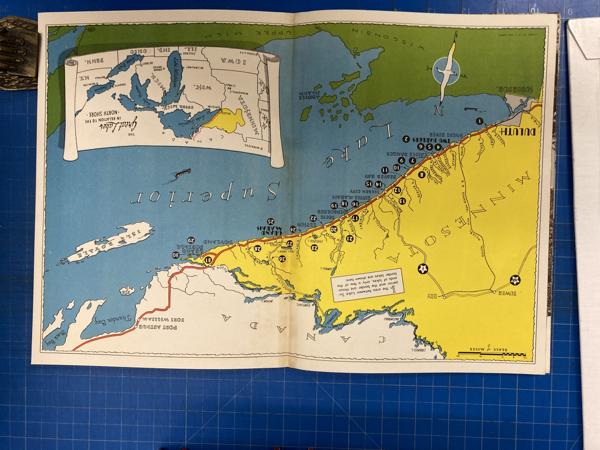 7 1/2" x 10 1/4" color pictorial wrappers, 48 pp., foreword, illustrated, color map of North Shore Drive on rear end pages. A picture record of scenes taken along the North Shore Drive of Lake Superior, extending from Duluth, Minnesota, to the U.S. Canadian border. Profusely illustrated throughout with sepia toned photographs of bridges, ore docks, coal docks, ships, scenic views, fishing, etc. Lightly soiled wrappers else very good.