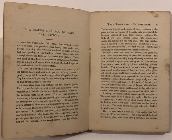 First Edition. Stiff Pictorial Wrappers. Pages 8-13. A brief story appearing in a publication entitled: One of the Best: True Stories of a Frontiersman. Stirring Episodes in the Life of Captain. L. M. Palmer (Late of the Royal Canadian North West Mounted Police and 28th M.I.) Soldier, Scout, Cow Puncher & Bronc Buster. Adventures By Flood and Field By W. W. Kennedy. Fictionalized claim of an encounter with Bob Dalton, closing with the ridiculous statement that Bob was killed robbing a bank in Coffeeville, along with 13 others killed and 17 or 18 wounded!! Considerable wear to wrappers splitting along portions of the spine. Good. Rare.
