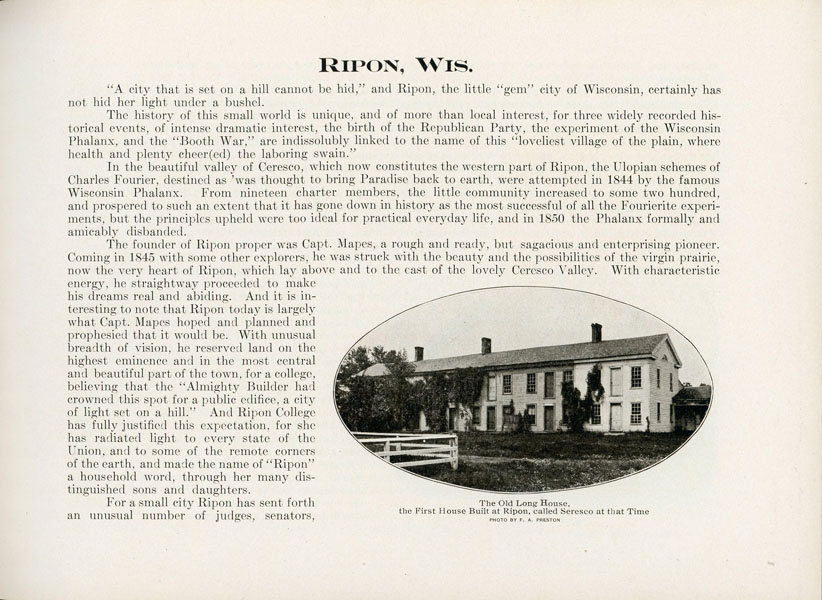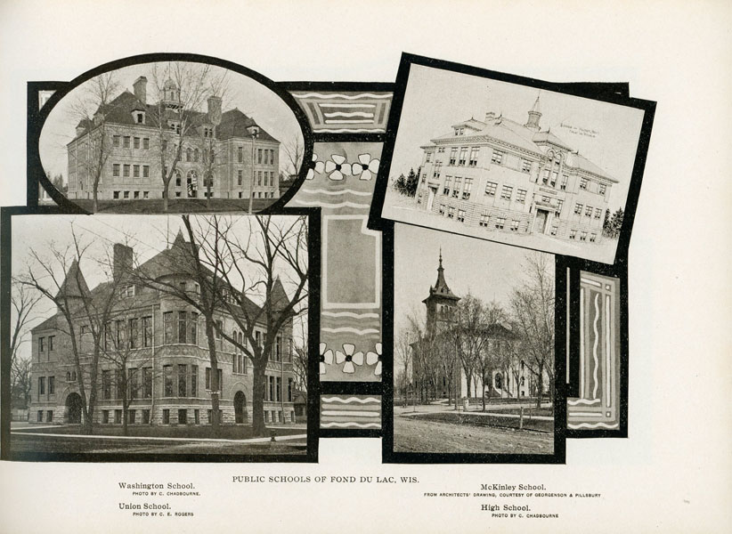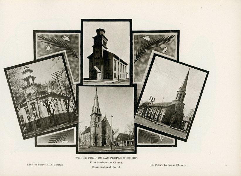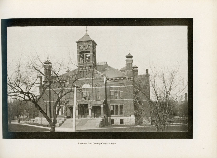 Oblong 16mo. 10 1/2" x 6 1/2" original green cloth with gold gilt stamped title on the front cover, decorated front and rear endpapers, 12 pp. of text plus 36 plates (2 folded), views by "Rogers, the Picture Man" in halftone by Wright & Joys Co. Eastern Wisconsin, southeast of Oshkosh, at the head of Lake Winnebago. Text on Fond du Lac, Ripon, and Waupun, illustrations of prominent buildings, blocks, churches, residences, schools, alms house, hospital, Bowen Refrigerators, Gurney Refrigerator Co., M.D. Wells Shoe Factory, Winnebago Furniture Co., lumber companies and saw mills, brewery, railroads, Ripon College, state penitentiary, yachting at Lakeside Park, Green Lake, etc. Front hinge just beginning to loosen, else a near fine copy.