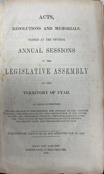 First edition. 8vo. 8" x 6." Bound in later tan buckram over heavy boards, red and black spine labels, gilt lettering, 460 pp., index, addenda. This volume collects the first laws of Utah Territory, established by Mormon settlers as the State of Deseret in 1849 and organized as Utah Territory by the Federal government in 1850. Contains acts and laws of Deseret, 1850-1855, while Brigham Young was Governor of the State of Deseret. The laws of the fourth annual session were not printed separately; they only appeared in this compilation. Topics of laws (with punishments) include: gambling; gunpowder; kidnapping; lewdness; enticing a female to house of ill fame; etc. Also covered are many non-criminal activities such as: free schools; roads and bridges; ferries; cutting timber; land and water grants for Brigham Young, etc. It also contains the first published versions of the constitution of the State of Deseret and the 1851 Ordinances of General Assembly. Topics of laws (with punishments) include: gambling; gunpowder; kidnapping; lewdness; enticing a female to house of ill fame; etc. Also covered are many non-criminal activities such as: free schools; roads and bridges; ferries; cutting timber; land and water grants for Brigham Young, etc.
