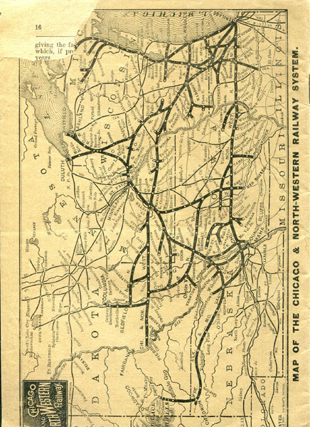 First edition. 7 5/8" x 5 3/8" original stapled, printed wrappers, 16 pp., map of the Chicago & North-Western Railway system on the back cover. Primarily a series of signed testimonials solicited by the Railway to describe “the Dakota boom.” Farmers relate their experiences settling and cultivating the land, detail their crop yields and profits from cattle ranching, and encourage further settlement, as land is still inexpensive and readily available. Several describe the settlers as “a most excellent class of people,” who are educated, industrious and and morally upright. And if that’s not incentive enough, there’s the unsurpassed healthfulness of the air, which is “free from malaria, and full of inspiring oxygen and invigorating ozone.” 3 copies found in OCLC. Top corner of rear cover has been torn away but with minor influence on the railway system map, else very good.