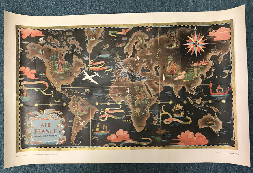First edition. Limited to 300 copies. 92 x 62.2 cm [39" x 24 1/2"] full sheet, image size is 89.7 x 52.4 cm [35 3/8" x 21 1/2"], color, planisphere air travel map. The artist for this map is Lucien Boucher (1889-1971). Known by Air France as Mr. Planosphere he created these designs between 1934 - 1962. Beginning around 1935, Boucher designed an impressive series of posters for Air France that he continued producing until he was well into his seventies. Boucher is known mainly for his absorbing Air France poster designs; known as "Monsieur Planisphere" (planispheres are flattened representation of planet earth) he created a variety of illustrated World Maps that depicted the global flight routes serviced by the airline. Fine, bright copy, suitable for framing