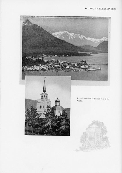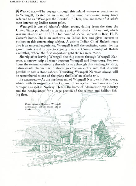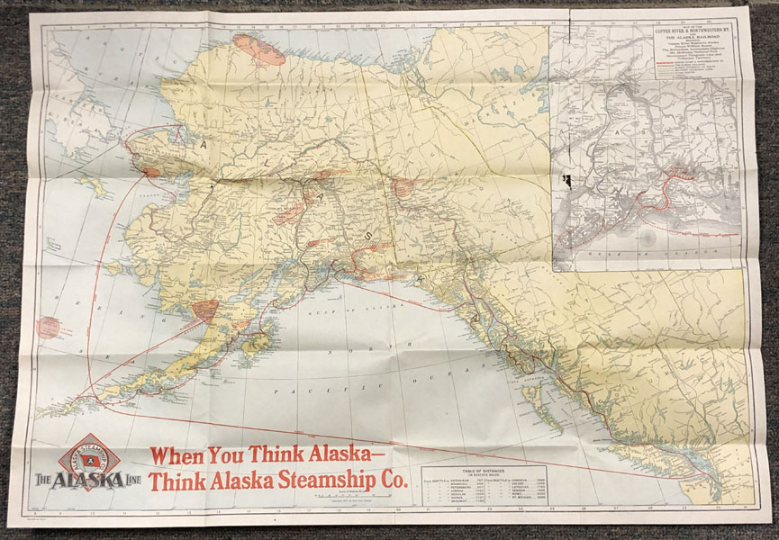 10 3/4" x 7 3/4" in colorful pictorial wrappers showing a husky on the left side and a colorful totem pole on the right side of the cover panel. 40 pp., illustrations, map. Romantic depiction of Sailing Sheltered Seas to the Land of the Midnight Sun. Descriptions of what the tourist can expect to see while cruising through the Inside Passage, to Ketchikan, Wrangell, Juneau, the Gastineau Channel, Skagway, Sitka, Cordova, the Columbia Glacier, Valdez, Seward, Fairbanks, etc. Much information about traveling the famous "Golden Belt Line Tour" via the Alaska Railroad. Listing of 6 cruises and tours for the summer season, lasting from 11-23 days. Inside rear wrapper is a pocked containing a 22" x 32" color map of Alaska showing the various routes. Map has splitting at some folds and with 1/4" x 1/2" chip missing at one fold. Illustrations of various scenes, printed in green, red, pink or burnt orange at bottom of every page to include illustrations of Victoria, the Grenville Channel, Chief Shake's House, Alaska-Juneau gold mining company, Lake Eyak, Kennecott, interiors of various cabins, etc. Black and white photographs opposite each page of text to include photos of the various ships' interiors and exteriors, Fairbanks, Seward, Child's Glacier, Mount Fairweather, Chilkoot, Ketchikan, etc. Wrappers lightly soiled with rubbing to spine, light chipping to bottom edge and foxing to rear wrapper. Very good. Filled with information, this is a nicely produced booklet.