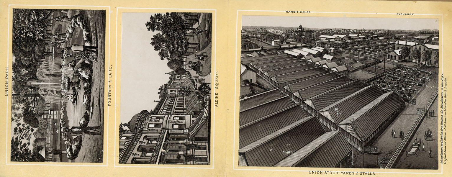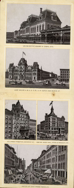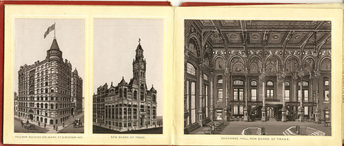 First edition. 5" X 6" embossed red boards, gold gilt cover title, 14 panels of views including a double-page one at the front, accordion-folds. Views include: a panoramic birdseye view of Chicago and the Lake Front; Post Office & Custom House; Pullman Building; Exchange Hall; New Board of Trade; Grand Pacific Hotel; Auditorium Building; Congress Street from Wabash to Michigan Avenues; Tacoma Building; Owings Building; State Street; Union Depot; Columbia Theater; Water Street; Union Stock Yards & Stalls; etc. Light wear to the spine ends and rear cover, else very good.