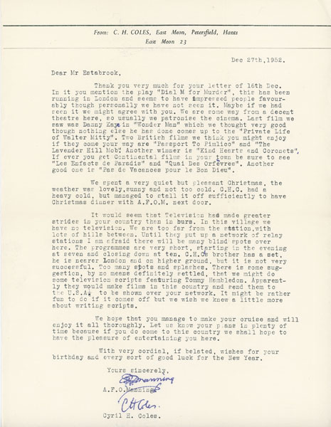 First U. S. edition. Cloth sunned on the spine with page edges evenly tanned else fine in dust jacket with light wear to the extremities. Included is a typed letter and envelope addressed to H.A. Estabrook Esq. and signed by the authors of the book, Adelaide Frances Oke Manning and Cyril Henry Coles. Tommy Hambledon, a British secret agent, investigates a case that includes stolen jewels, secret airplane plans, gangsters, and international assassins. A Crime Club mystery.