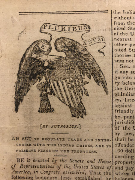 One-page extract from the newspaper, the Philadelphia Aurora, April 16, 1802. 20.5"x16". Five-column text. Signed in type by President Thomas Jefferson, Vice-President Aaron Burr, and Speaker of the House Nathaniel Macon. This act was first promulgated in 1790 and renewed every two years until this 1802 permanent version, which remained in force until 1834. This complete printing of the Act is headed with a vibrant woodcut of the American eagle holding arrows in one claw and an olive branch in the other, the American shield on midsection, and with a banner inscribed "E Pluribus Unum." Below in brackets is "By Authority." The Act is lengthy and occupies almost 90% of the page. The page has one horizontal and one vertical fold and a little chipping to the blank margin along the left edge, not affecting the text. Very good condition, and would display well. This is a significant piece of legislation during Thomas Jefferson’s presidency. "The act stipulated that no person could engage in trade or intercourse with Indian tribes without a license issued by the superintendent of the relevant department or another person appointed by the President of the United States; it required the applicant to provide one or more sureties and enter into a bond of $1,000 (payable to the President) to ensure compliance with rules and regulations governing Indian trade and interaction123; it aimed to regulate and facilitate trade between settlers and Indian tribes; it recognized the importance of maintaining peace on the frontier by ensuring fair and lawful interactions; it addressed the issue of ardent spirits (alcohol) abuse among Indians; and it emphasized the importance of defining boundaries between settlers and Indian territories123. The legislature considered whether the punishment for certain offenses by Indians (such as death by hanging) could be commuted to military execution to avoid cultural sensitivities. In summary, this act played a crucial role in shaping trade relations, preserving peace, and addressing cultural considerations between settlers and Native American tribes during the early 19th century." An important record.