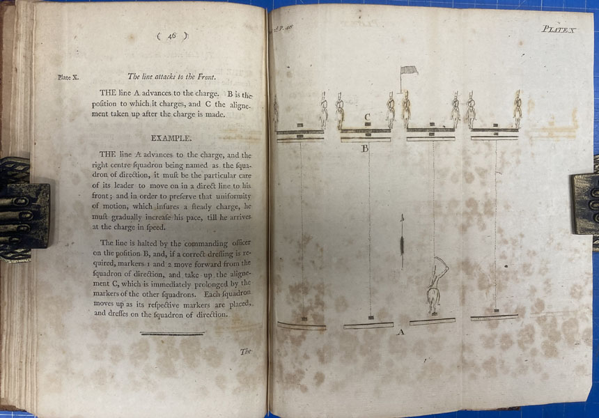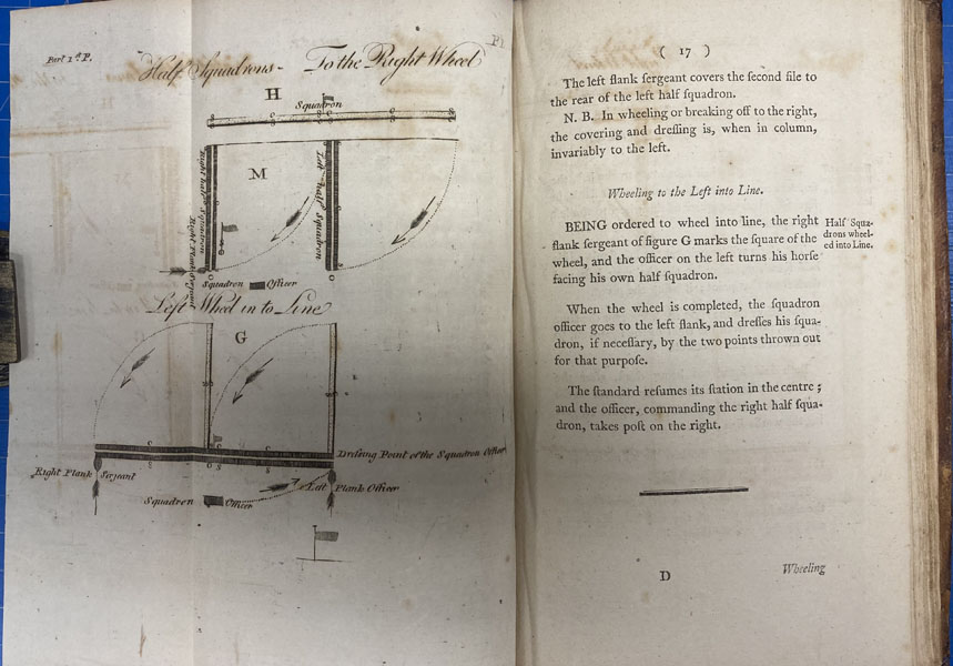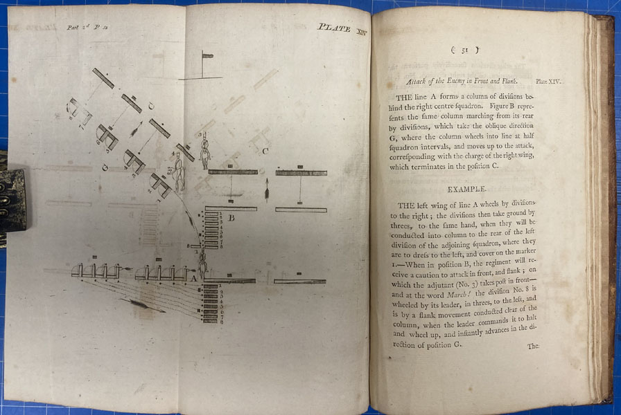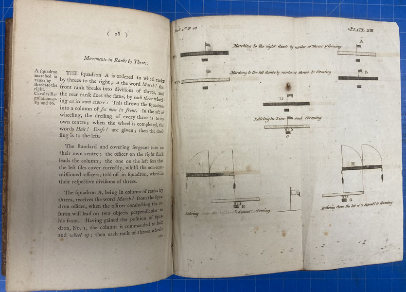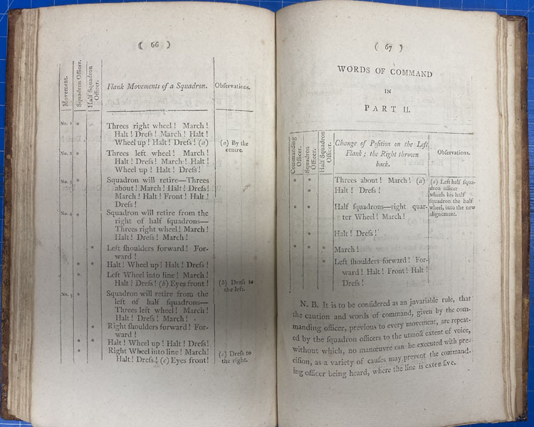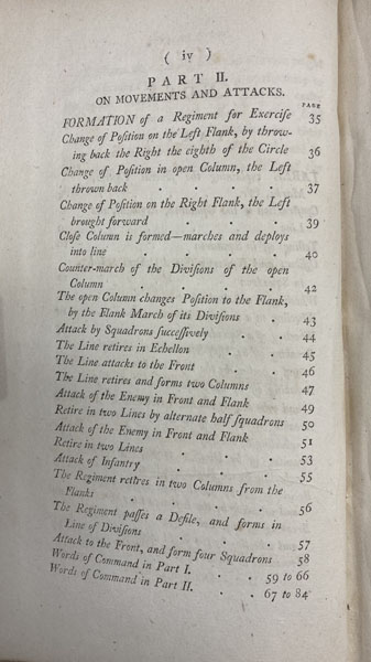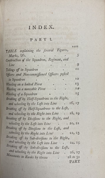 First American edition from the Third London edition.8vo. Leather covers, [2], iv - 5 -84 pp., introduction, index, several folding plates. This book is intended for the instruction of officers entering into cavalry service. It is divided into two parts. The first part describes the formation and wheelings of a squadron, and the second part shows the application of those principles of movement contained in the first part. Covers used, interior tight and serviceable else a good copy of a book on early cavalry tactics.