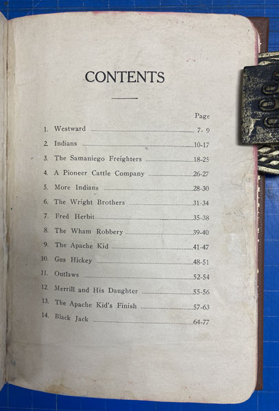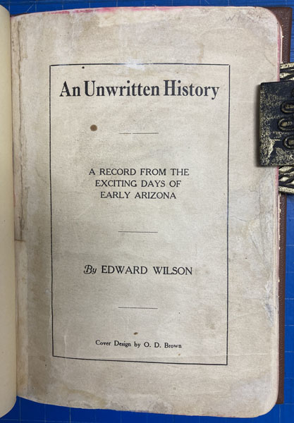 First edition. 12mo. Full leather binding, titles stamped in gilt on the front cover, decorated front and rear endpapers, [6], 7 - 77 [1] pp., preface. Edward Wilson's 1915 account of life in southeastern Arizona. The killing of the Wright men in 1882 and of H.H. Merrill in 1895, the Apache attack on Mariano Samaniego's freight wagons, the robbery of Army paymaster G.W. Wham in 1889, the tale of Gus Hickey's Indian fight, the story of train robbers Joe George and Grant Wheeler, and an account of the mysterious outlaw William "Black Jack" Christian, are among the many reminiscences of Wilson. Herd 2537 says "Rare." Six Guns 2417 says "Among other stories about early Arizona the author gives accounts of the Apache Kid; Grant Wheeler, the train robber; and a man called Black Jack --- evidently Black Jack Christian, for the author says he was not Tom Ketchum." This book was originally published in pictorial cloth but our copy has been rebound in full leather with decorated front and rear end papers with the contents clean and tight. An attractive copy of a rare book, seldom seen for sale.