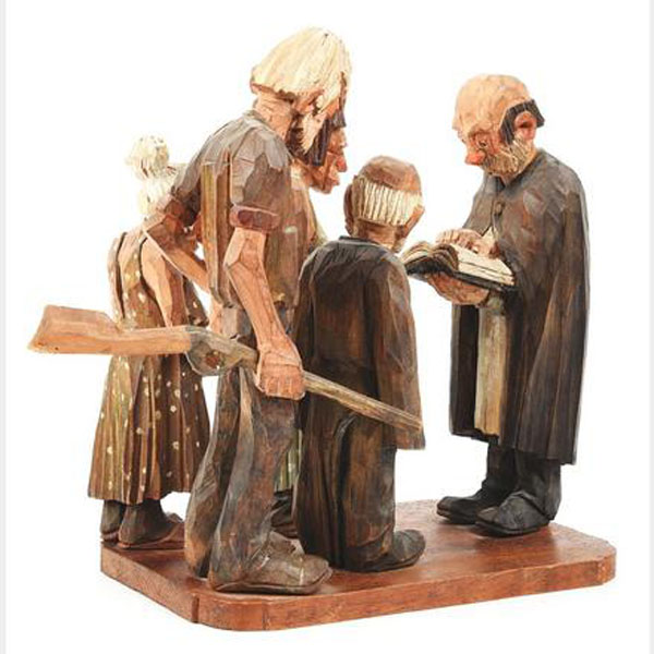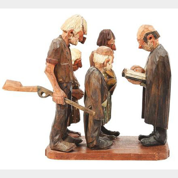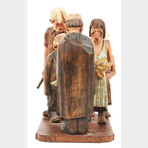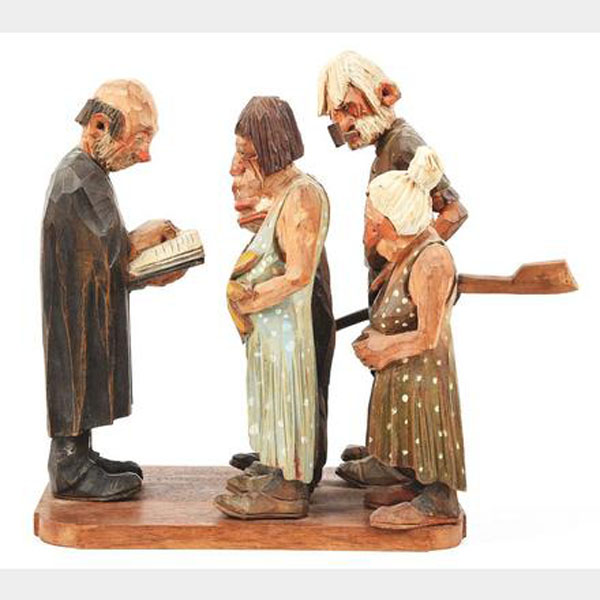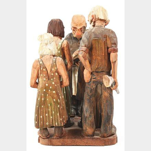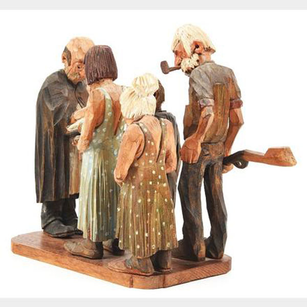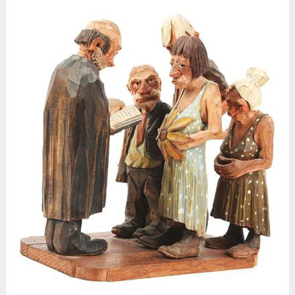 A five-piece wood carved scene by one of the recognized masters of 20th Century woodcarving, Andy Anderson (1893 - 1963). Wood carving 10 1/2" tall x 12" deep and 6" wide of one of Andy's classic scenes, "Shotgun Wedding" that includes five figures, the happy couple, the parents and the preacher. Signed "Andy" on the back of each figure. Fine.