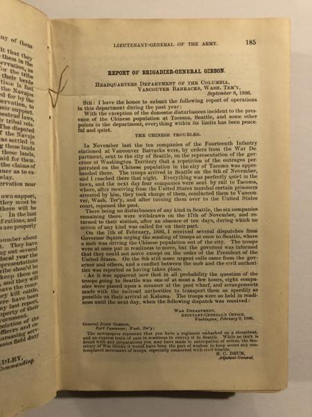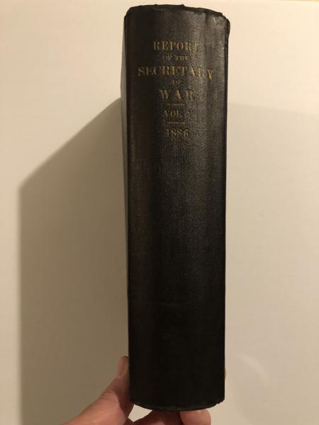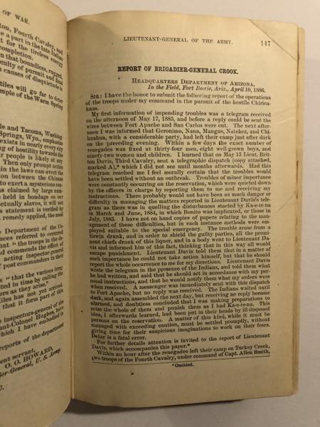 First edition. Thick 8vo. Cloth, 837 pp., illustrated, plates, tables, maps, index. One foldout Army Organizational chart, one large, very detailed foldout map of the Field of Operations Against the Apaches, and one large foldout map of West Point Military Academy in 1883. Contains General Crook's report of his actions against the Chiracahua Apaches, Captain Lawton's report of operations against Geronimo's and Natchez's bands of hostile Indians, and mentions Crook being reassigned and Miles assuming command. General Terry's report on the affairs of the Department of the Missouri, General Howard's report upon the military operations and condition of the Division of the Pacific, General Stanley and his report on activities in Texas to completely patrol and watch the border line between the United States and Mexico, General Ruger's report of military operations in the Department of Dakota, etc. A great source for the Apache Wars. This is a surplus copy from the Office of the Army's Quartermaster General, with their neat bookplate and small stamp, else a very good-near fine, tight copy of an important book.