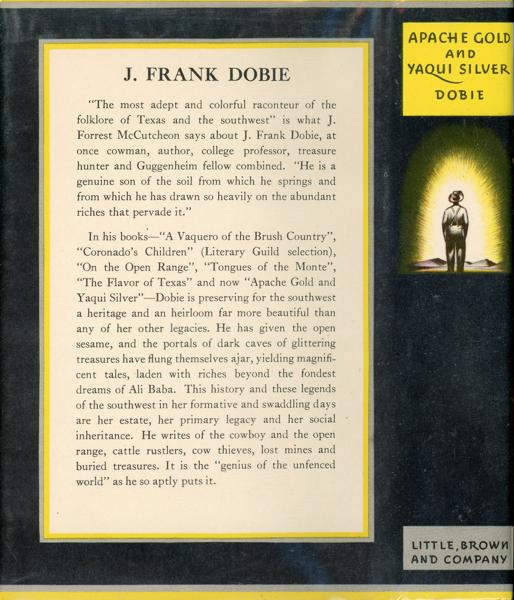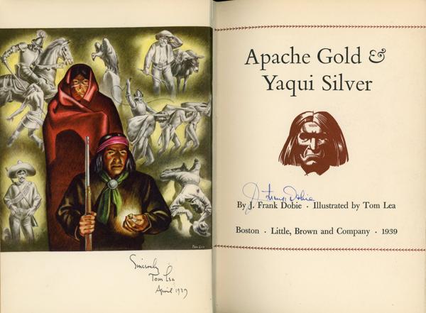 First Trade edition. 8vo, Signed by Dobie on the title page and signed and dated in the year of publication by Tom Lea at the frontispiece. Original black and gilt stamped brown cloth, colored frontispiece, 12 plates (4 are in color), and numerous illustrations by Tom Lea, appendix, 366 pp. "Buried vaults stacked with gold bars, secret caches of coins and jewels plundered from the Spaniards and the Church, exposed veins of ore with nuggets the size of turkey eggs. Guarded by the bones of dead men, the legendary treasures of the Southwest still wait for those foolhardy or desperate enough to seek them. A collection of tales, introducing the reader to Pedro Loco, General Mexhuira's ghost, the German, and a colorful group of odd fellows driven to roam the hills in an eternal quest for the hidden entrance, the blazed tree, the box canyon, for fabulous wealth glimpsed, lost, and never forgotten." SIX GUNS 599 says "Fascinating book on lost mines...." Former owner's inked name at top of front pastedown sheet, a few pages carelessly opened have created tiny nicks and chips to fore-edges else this is the nicest copy of the trade edition that we have handled in several years. The copy is bright and tight and the dust jacket is fine and bright. A handsome copy!