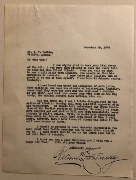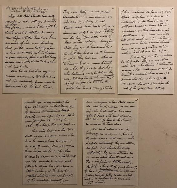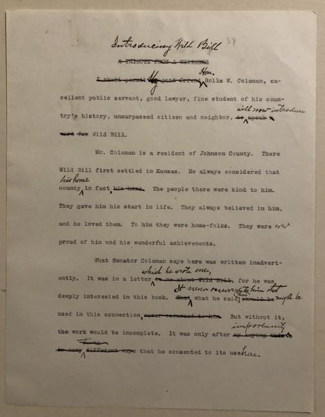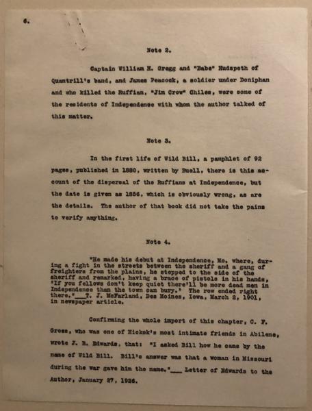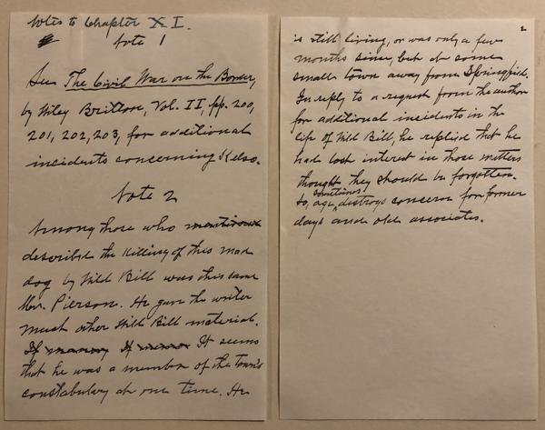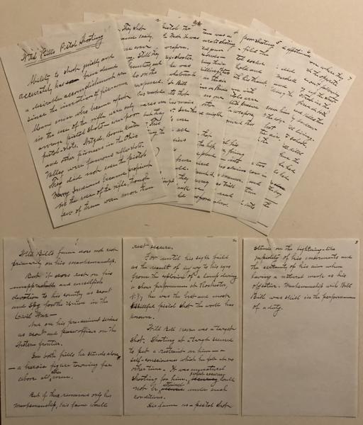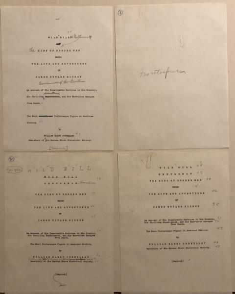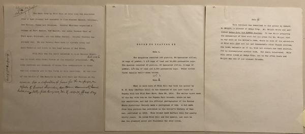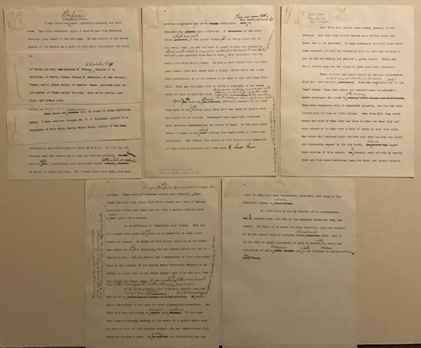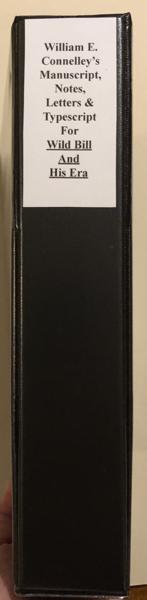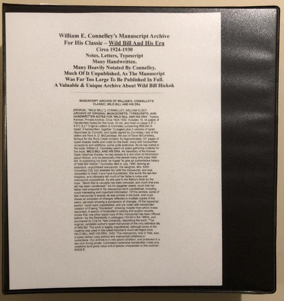 Includes: 1). 44 pages of Handwritten Notes for this book, (in ink, and most on paper 5.5" x 8.5"); 2.) 7 Original Letters to Connelley concerning Wild Bill (4 typed, 3 handwritten, together 13 pages) plus 2 carbons of typed responses by Connelly, and boldly signed by Connelley---two of the letters are from A. D. McCandless, the son of Dave McCandless, famous for the Rock Creek incident; 3.) Approximately 181 pages of typed chapter drafts and notes for the book, many with handwritten corrections and additions, some quite extensive. As he has stated in the book, William E. Connelley spent 42 years gathering material for the book, WILD BILL AND HIS ERA. As Secretary of the Kansas State Historical Society, he had access to a rich store of information about Hickok, and he personally interviewed many who knew Wild Bill. In publishing his book, he hoped "to give an authoritative history of 'Wild Bill' Hickok." Connelley died in July, 1930, leaving an extensive, unpublished manuscript. His daughter, Mrs. Edith Connelley Clift, had assisted him with the manuscript, and was compelled to finish it and have it published. She wrote the last few chapters, and ultimately left much of her father's notes and manuscript unpublished. As she said in the Editor's Note for the book, "Much that is valuable has been removed, and much that was left has been condensed." As his daughter stated, much that her father had prepared in his manuscript went unpublished, including much interesting and important information. Of this archive, some of this manuscript is exactly as was printed in the book, and much shows an evolution of changes reflected in multiple copies of the same, yet each showing a succession of changes. Of the typescript portion, much went unpublished, and are noted with handwritten notation of it being "Discarded", showing chapter from which it was discarded. A search of bookseller's catalog and auction records shows that one other typed copy of this manuscript has been offered before---by the Eberstadts in catalogue 134:54 in the 1950's, and purchased by Coe for Yale University, describing the work; "The original, complete author's typed manuscript of the only definitive life of Wild Bill. The work is largely unpublished, although some of the material was used in the noted historian's much-abridged book WILD BILL AND HIS ERA, 1933." This manuscript, now in Yale, was a typed carbon copy without any manuscript notations or corrections. Our archive is in very good condition, and protected in a two-inch 3-ring binder. Connelley's extensive handwritten notes and notations lend great value and a special uniqueness to this archive!
