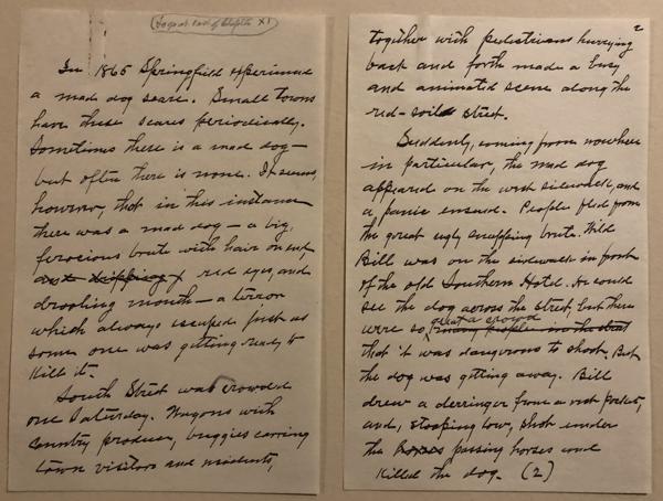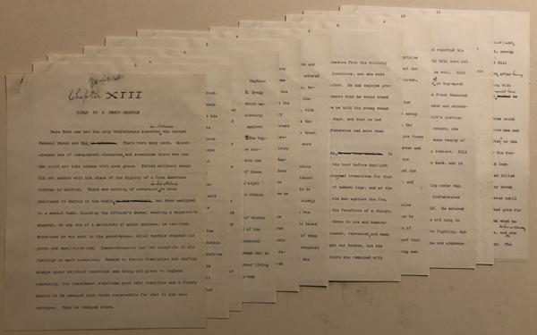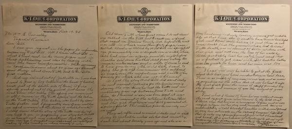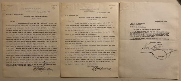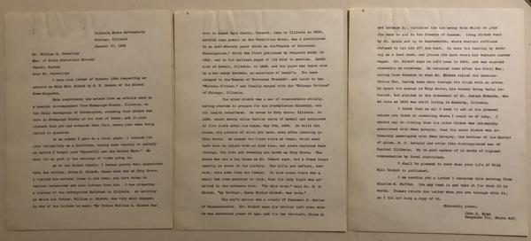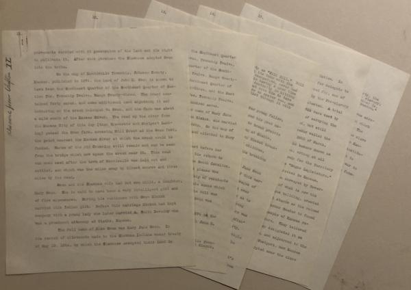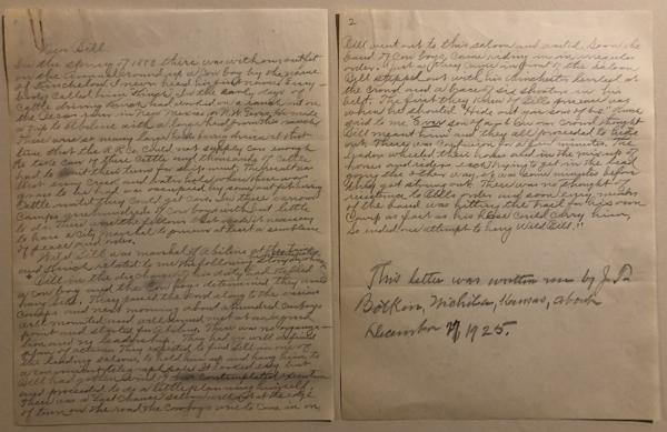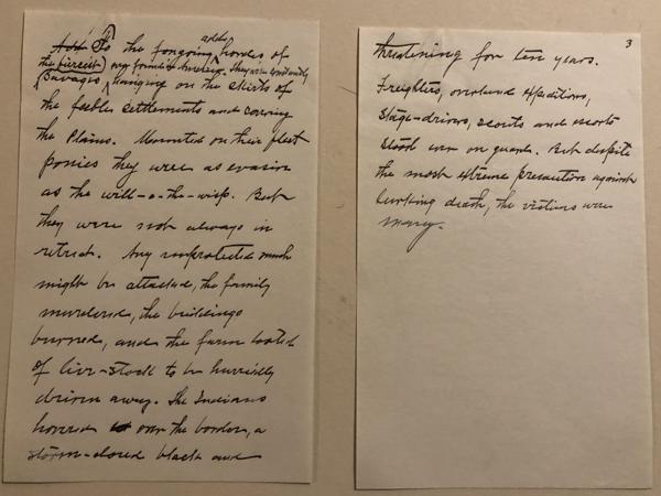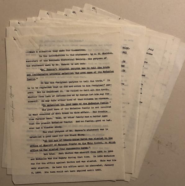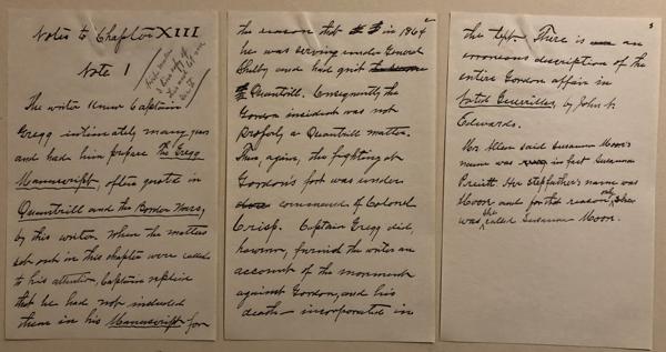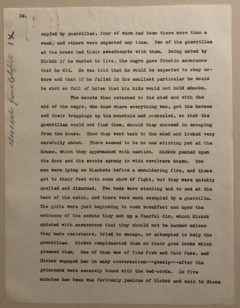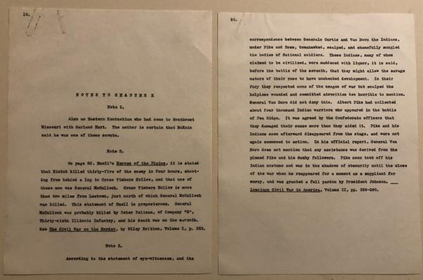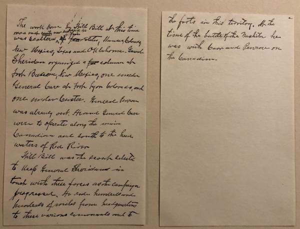 Includes: 1). 44 pages of Handwritten Notes for this book, (in ink, and most on paper 5.5" x 8.5"); 2.) 7 Original Letters to Connelley concerning Wild Bill (4 typed, 3 handwritten, together 13 pages) plus 2 carbons of typed responses by Connelly, and boldly signed by Connelley---two of the letters are from A. D. McCandless, the son of Dave McCandless, famous for the Rock Creek incident; 3.) Approximately 181 pages of typed chapter drafts and notes for the book, many with handwritten corrections and additions, some quite extensive. As he has stated in the book, William E. Connelley spent 42 years gathering material for the book, WILD BILL AND HIS ERA. As Secretary of the Kansas State Historical Society, he had access to a rich store of information about Hickok, and he personally interviewed many who knew Wild Bill. In publishing his book, he hoped "to give an authoritative history of 'Wild Bill' Hickok." Connelley died in July, 1930, leaving an extensive, unpublished manuscript. His daughter, Mrs. Edith Connelley Clift, had assisted him with the manuscript, and was compelled to finish it and have it published. She wrote the last few chapters, and ultimately left much of her father's notes and manuscript unpublished. As she said in the Editor's Note for the book, "Much that is valuable has been removed, and much that was left has been condensed." As his daughter stated, much that her father had prepared in his manuscript went unpublished, including much interesting and important information. Of this archive, some of this manuscript is exactly as was printed in the book, and much shows an evolution of changes reflected in multiple copies of the same, yet each showing a succession of changes. Of the typescript portion, much went unpublished, and are noted with handwritten notation of it being "Discarded", showing chapter from which it was discarded. A search of bookseller's catalog and auction records shows that one other typed copy of this manuscript has been offered before---by the Eberstadts in catalogue 134:54 in the 1950's, and purchased by Coe for Yale University, describing the work; "The original, complete author's typed manuscript of the only definitive life of Wild Bill. The work is largely unpublished, although some of the material was used in the noted historian's much-abridged book WILD BILL AND HIS ERA, 1933." This manuscript, now in Yale, was a typed carbon copy without any manuscript notations or corrections. Our archive is in very good condition, and protected in a two-inch 3-ring binder. Connelley's extensive handwritten notes and notations lend great value and a special uniqueness to this archive!