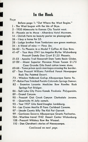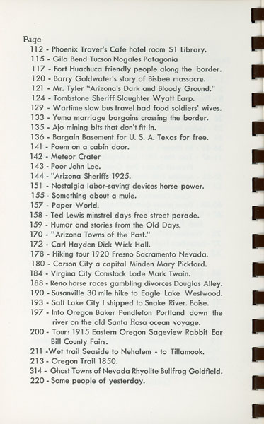 First edition. 8vo. Spiral bound printed wrappers, [20], 221 [1] pp., illustrated from photographs. Laid-in a keep-sake about the author with his signed and dated card. The author is a printer who type-set this book which took more than three years to complete. Much about early Arizona. Very good tight copy.