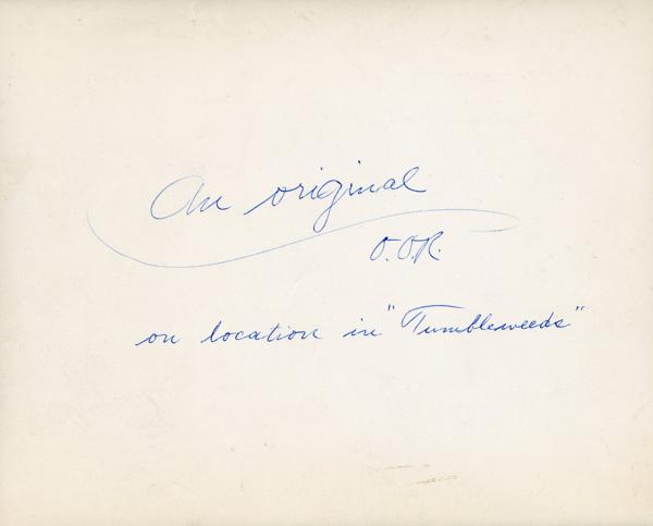 8" x 10" black & white photograph boldly inscribed in black ink on upper front corner.: "To my friend Orie Robertson / Chas. A. Siringo / Altadena, Calif. / 1927." The subjects in the photograph are identified in the lower left corner.as "Wm. S. Hart and Chas. A. Siringo in 'Tumbleweeds." Also signed on verso "An original O. O. R. on location in Tumbleweeds." Photograph is inscribed by legendary Western Americana author, lawman, Texas Ranger, bounty hunter and former Pinkerton agent Charles Siringo (1855-1928). As an agent for the Pinkerton National Detective Agency he served them well but it ended with bitter lawsuits between the the two parties. Siringo also was noted for as being the author of several books including "A Texas Cowboy," "A Cowboy Detective," "Riata and Spurs," and others. William S. Hart (1870-1946) became a stage actor at about 17 and during 20 years in the theater appeared in Shakespearean and classical roles. His motion picture career began in 1914 with two-reel films; from 1915 to 1925 he was perhaps the most popular western star, his final major picture being "Tunbleweeds," in 1925. According to the IMDB page, "Robertson started his career acting in the Grand Opera House in Los Angeles in 1908 and moved into films in 1920 playing cowboys and serving as a stuntman. He served in the Remount Service during World War I and was a member of the Hollywood Masonic Lodge and the Chuck Wagon Trailers." In this instance it appears Robertson was a set photographer for the film "Tumbleweeds." Photograph states 1927 but according to the IMDD page, the movie was filmed in 1925. A few small crease else a near fine photograph with nice contrasts. Rare as we find only a few records of signed Siringo photographs.