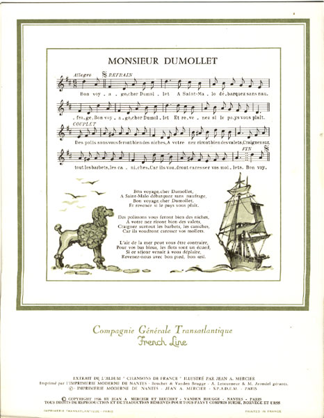 10 1/2" x 8 1/4" with beautiful color artwork by Jean A. Mercier on front cover. Rear cover offers words and music to the song "Monsieur Dumollet," with an illustration of a poodle on one side of the words and a sail boat on the opposite side. The S.S. France was one of the last transatlantic liners. "One area given an unusual amount of attention was the ship's kitchens; 1,500 square meters in area, and placed almost amidships, between the two dining rooms which the one kitchen served. It was thought by the CGT directors that the France would not only display the best in French art and design, but also French cuisine. The kitchens were equipped with the most advanced machinery available, as well as many traditional cooking aides, including a stove that was 12 meters long and 2.5 meters wide. Staffed with 180 of France's best cooks, sauce and pastry chefs, rotisserie cooks, head waiters and wine stewards, this team made the France one of the finest restaurants in the world." This is reflected in the menu offerings. Chef des Cuisines: Ettienne Kraemer. The menu is offered in French on the inside of the front page; the menu is offered in English on the facing page. Tiny bump to lower corner. A beautiful menu with vibrant colors.