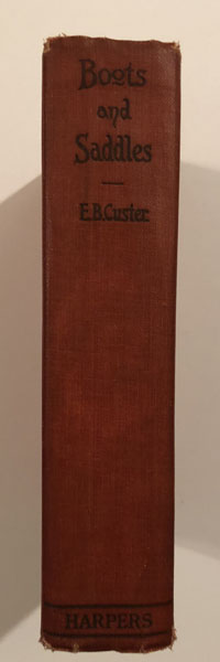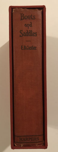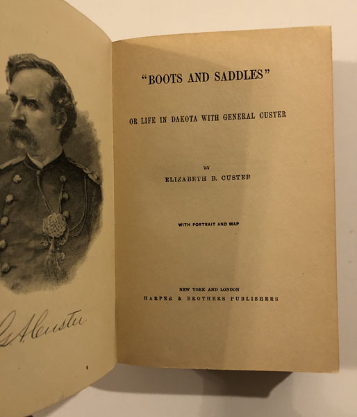 Seventh Printing. Red Cloth. 315pp. Map. Appendices. Tal Luther in his Custer High Spots #4 says, "Mrs. Custer was a charming and talented woman who idolized her husband. Although Elizabeth Custer may picture her husband in the most favorable light, the books are revealing. Those whose interest centers primarily on the Battle of the Little Big Horn itself might wish to restrict themselves to Boots and Saddles. Its last chapter is poignant and beautifully written." "The warm, loving reminiscences of Custer's devoted wife Libbie during their three years in Dakota Territory, detailing the good times as well as the hardships and heartaches of western frontier life... With appendix with extracts from letters written by General Custer, 1873-76, and Custer's farewell address to his troops at the close of the Civil War."--O'Keefe 658. A very good copy with some modest general wear and a small spot on front and rear covers. This special copy is signed, with a noteworthy and lengthy inscription, written neatly and positioned centrally on the front free endpaper: "Motto on General Custer's Spanish sword 'Do not draw me without cause Do not sheath me without honor.' Elizabeth B. Custer April 8th 1925." Protected in custom cloth slipcase with some very slight damp staining to upper portion of one side.
