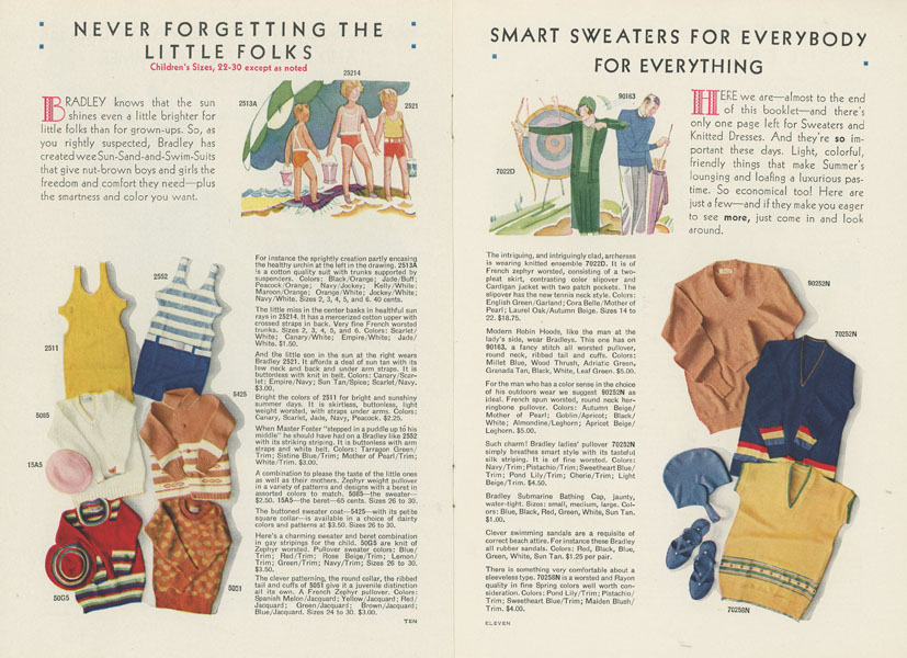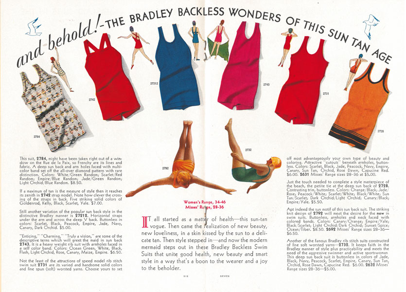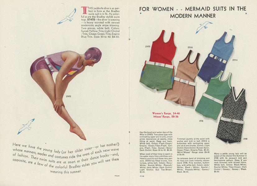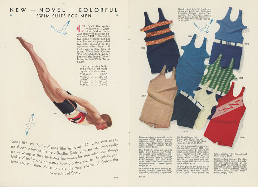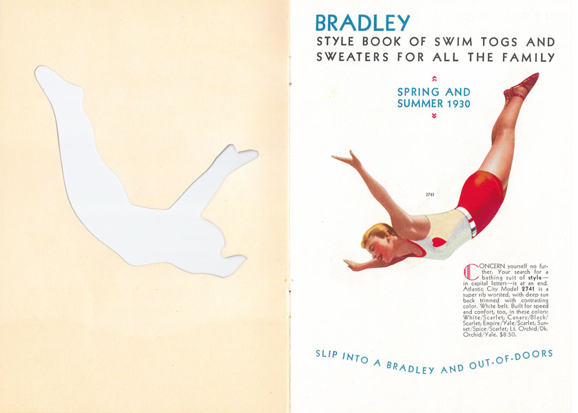 First edition. 8-1/4" x 5-3/4" striking pictorial wrappers showing a cut out of a woman diving in a Bradley bathing suit. 16 pp. including wrappers. Color illustrations. A very nice catalog of swimsuits for women and men. Listed are "New Novel Colorful Swim Suits For Men" as wells as "Mermaid Suits In The Modern Manner," "The Bradley Backless Wonders Of This Sun Tan Age," "Bradleys For The Conservative Dresser And For The Fast Swimmer," for women and bathing suits for children. Also offers "smart sweaters for everybody for everything," along with a little bit of sportswear. Very light discoloration else fine. A beautiful catalog.
