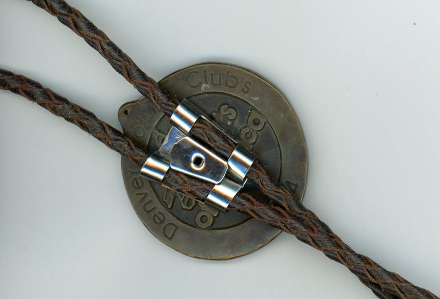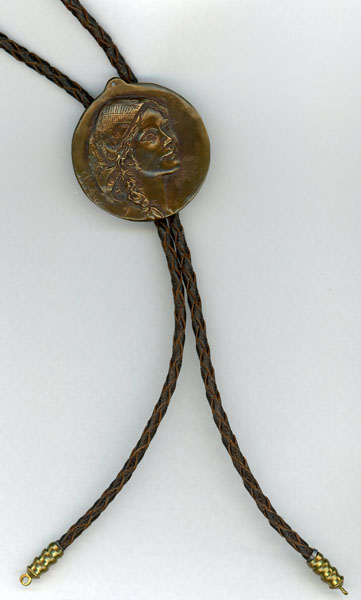 The bronze medallion was created in 1984 by Glenna Goodacre who was selected by the Denver Rotary Club Foundation as the artist of the year. The Denver Rotary Club Foundation sponsored the successful Artists of America show for twenty years from 1981 until 2000. Each year an artist was selected to produce a work of art for a medallion. These were used as fundraisers for the Foundation's charitable work. This medallion was the one created by Goodacre for the occasion of 1984. The previous owner of this one chose to have it converted to a bolo tie, most likely the only Glenna Goodacre bronze bolo tie in the world. A clip for the bolo cord was glued onto the back side, so no damage occurred to the original bronze. This is a rare opportunity for aficionados of bolo ties or anyone wanting the rare and unusual Glenna Goodacre bronze to own the unique Goodacre bronze sculpture. If desired, the bolo string could be removed, and the medallion could be worn as a pendant or displayed in that manner. Fine medallion.