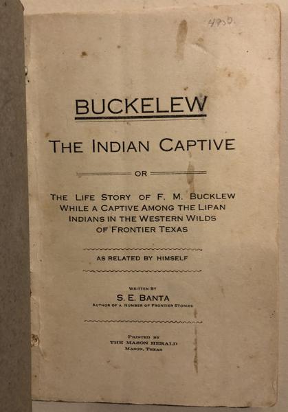 First Edition. Original Printed Grey Wrapper. Dedication. Preface. Frontispiece portrait of Mr. and Mrs. F. M. Buckelew. In 1854, Frank Buckelew came to Texas with his parents, both of whom died within a couple of years. Frank and his sisters went to live with an uncle on the Sabinal River in Bandera County. In late January, 1866. Shortly after, his uncle was killed by Indians. In March, 1866, while trying to round some cattle uo on foot, Frank was captured by Lipan Apaches and taken into the Big Bend country. After a year Frank was able to escape, and with the help of a friendly rancher he was taken to Fort Clark,Texas, where he was viewed as a curiosity by officers, and their wives and children. Eventually reunited with his sisters in Bandera, Frank lived the difficult life of an orphan, telling his story to S. E. Banta in 1911, and becoming a Methodist minister at the age of 41. This is a rare account! National Union Catalogue showing a listing but locating no copies. Not in Graff, Ayer, or Streeter Sale. According to Eberstadt 162 96: "Printed in an edition thought to have been limited to 50 copies: we have not seen another in many years." Not in the Eberstadt Texas Collection: "we can trace only a few copies being offered in the last forty years." Rebacked with front wrapper present, rear wrapper missing, and half of original spine retained and laid-down. Professional restoration to last page, reinforcing edges, with no loss of text. Some slight soiling to title page. A very good copy off a very rare work. Protected in chemise and Quarter-Leather Slipcase, with title, author, place and year of publication in gilt on spine.
