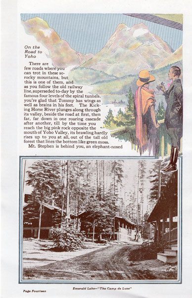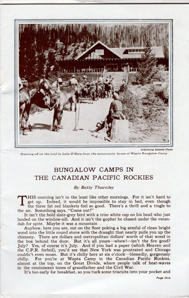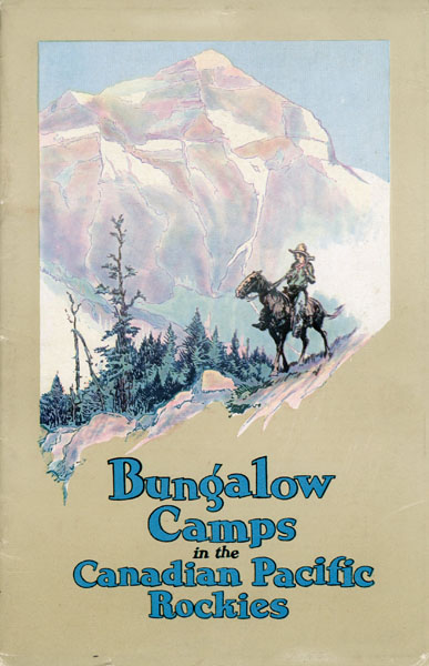First edition. 8vo. Original color, pictorial wrappers, 24 pp., illustrated from photographs and eleven color illustrations, 16 1/2" x 16 1/2" folded map affixed to the rear inside rear cover that folds to 8 1/4" x 5 1/2." The map shows the nine bungalow camps in th Canadian Pacific Rockies plus showing Wheeler's walking tours to Mount Assiniboine. Roads, trails, and Canadian Pacific Railway routes are shown. The map is in fine, unused condition. The author provides detailed information on nine Bungalow Camps, showing their location, number of accommodations, activities (if available), travel distances and preferred method of travel, entertainment, etc. Center page loose from staples, a few tiny nicks to the cover extremities, a light crease to the lower portion of the rear cover, else a near fine copy of a very well-presented booklet.