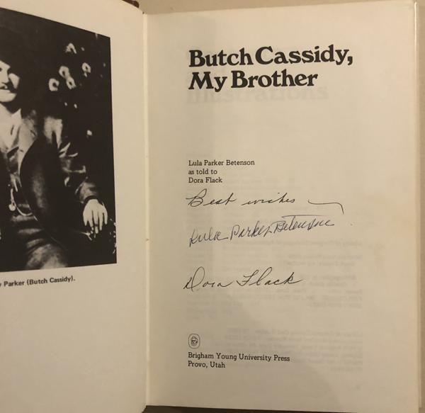 First Edition. Signed by Lula Parker Betenson and Dora Flack. 8vo. Boards, xiii [1], 265 pp., frontis., [portrait]. Foreword. Preface.Illustrated. Map. Appendices. Bibliography. Index. Adams 150 #10 says, "The complete history of Robert LeRoy Parker [Butch Cassidy] and his ancestry, his start in outlawry and the various robberies of which he was accused. This book puts to rest that fable about him being killed in Bolivia, South America, for he visited his family several times after his return to the states." Light rubbing to boards and some light edgewear. Very good in dust jacket with some light edgewear and a 1" closed tear to bottom edge of front panel.