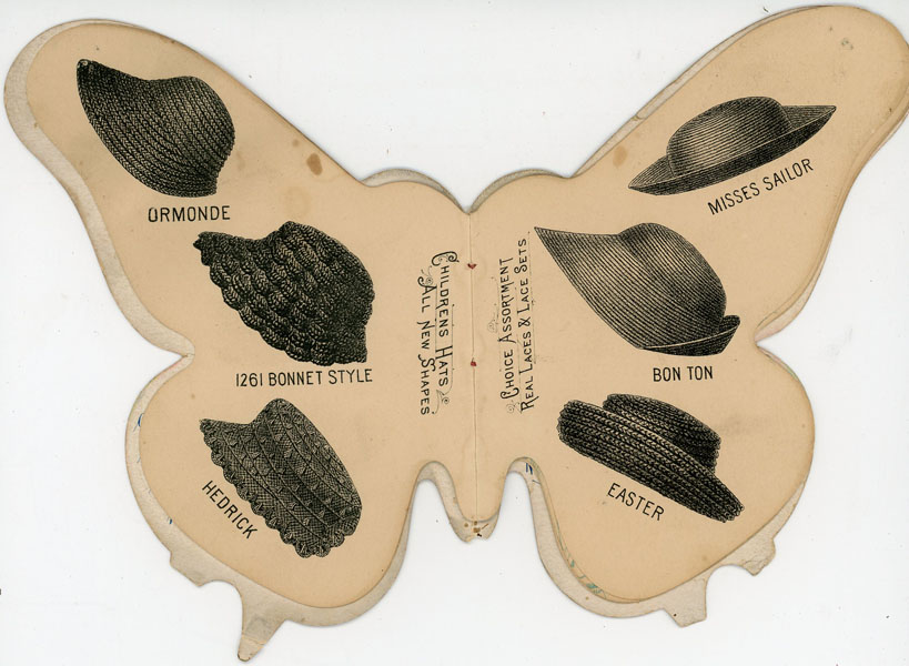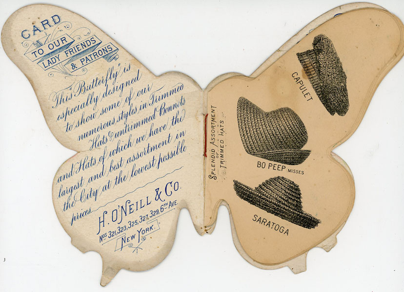 First edition. Colorfully designed die-cut 8" x 6" butterfly as a string-tied promotional sales catalog, folds to 4" x 3," n. p. (12 pp.), illustrated in black & white. This delightfully printed promotional catalogue for the millinery department at Hugh O’Neill’s Dry Goods Store whose impressive building at Sixth Ave. & 21st St. was an impressive domed building, now serving as condominiums. Noted for their inventive marketing catalogs and souvenir chromolithograph cards, this one illustrates the many Victorian trimmed hats which could be purchased "at the lowest possible price," including: Bo Peep Misses, Capulet, Easter, Hedrick, Ormonde & Bon Ton bonnets, as well as Virot, Gypsy Queen and Reckless hats. Founded in 1870, the Irish-American O'Neill (d. 1902) opened his distinctive store designed by Mortimer Merritt in 1887, and by 1892 employed 2500 people, and added a fifth floor to his store. After his death, the O'Neill store later merged with Adams Dry Goods, and closed down in 1907. Minor wear to the extremities and with minor loss to lower portion of the wings, discreet paper repair at the spine, else a solid, very good, bright copy.