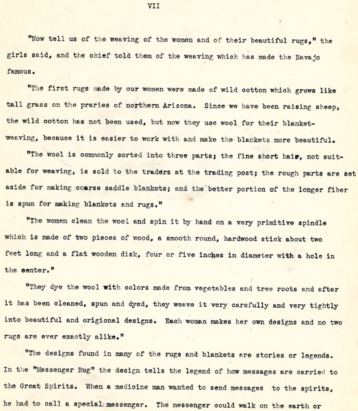 First edition. 8 1/2" x 11" typed sheets. Comprises seven short chapters in thirteen pages that tell the history of Navajo Indians from the Navajo point of view. Stories include splitting from the Apaches and relocating to Arizona and New Mexico; fighting Mexicans to maintain their new home; being defeated by Kit Carson and U. S. soldiers; learning silver-smithing from Mexicans and learning rug-making from Pueblo Indians. The sheets are in very good condition and are housed in the original transmittal envelope