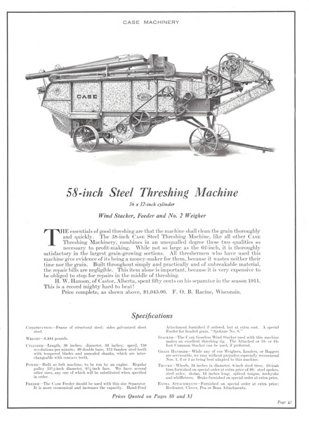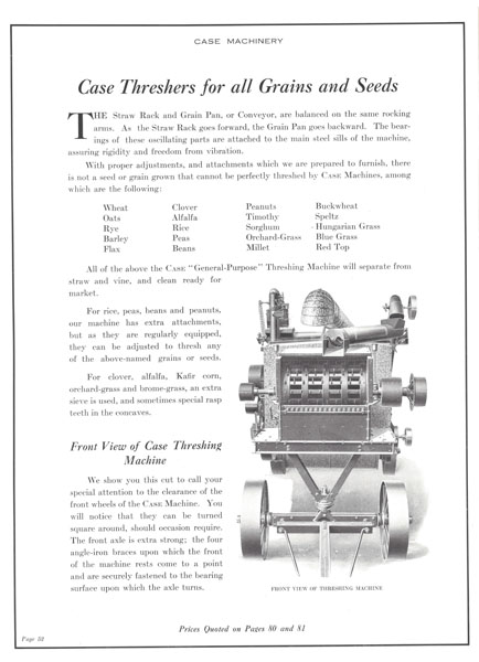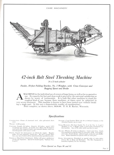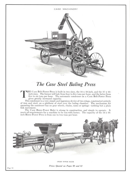 First edition. 4to. Color, pictorial stiff wrappers, 84 pp., illustrated in black & white, centerfold double-page color plate, price list, contents. This rare catalogue for the Case Threshing Machine Company, issued featuring their traction engines, portable engines, gas & oil tractors, threshing machines, road building equipment, and Case automobiles. Although Case had introduced their first gasoline tractor just 8 years before following the 1904 Louisiana Purchase Exposition, by 1912 they were winning tractor contests, such as the 1912 Winnipeg Motor Contest. Jerome Increase Case (1819- 1891) began building threshing machines in 1847 in Racine, Wisconsin, and by 1869 had engineered and built Case Steam Engine Number One. Subsequently, Case began producing a whole line of self-propelled traction engines, portable engines, twine binder machines, separators, stackers, and more. Their road building machinery line-up included not only Case steamrollers, but also rock crushers, elevators, screens and bins. In 1910, Case had purchased the Pierce Motor Co. and quickly began manufacturing the Pierce-Racine automobile, and later the Case Auto employing Pierce Motor Company's 8000 dealers and agents worldwide. Case produced touring models, sedans, coupes, and limousines, as well as race cars, with this catalogue featuring the Case 40 and the Case 30 Roadsters, Touring Cars, and Limousines. They ceased production of autos in the mid-1920s.; See: Case Construction Equipment History (2013); Leffingwell, Classic Farm Tractors: History of the Farm Tractor, Chapter 2; Bill Ganzel, Wessels Living History Farm, York, Nebraska (2014). Front and rear covers lightly soiled, tiny closed tears and light wrinkles to the fore-edges of six internal pages else a very good copy of a scarce catalogue.
