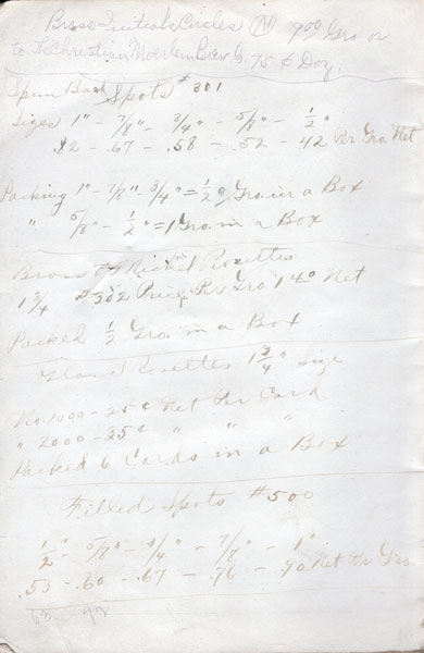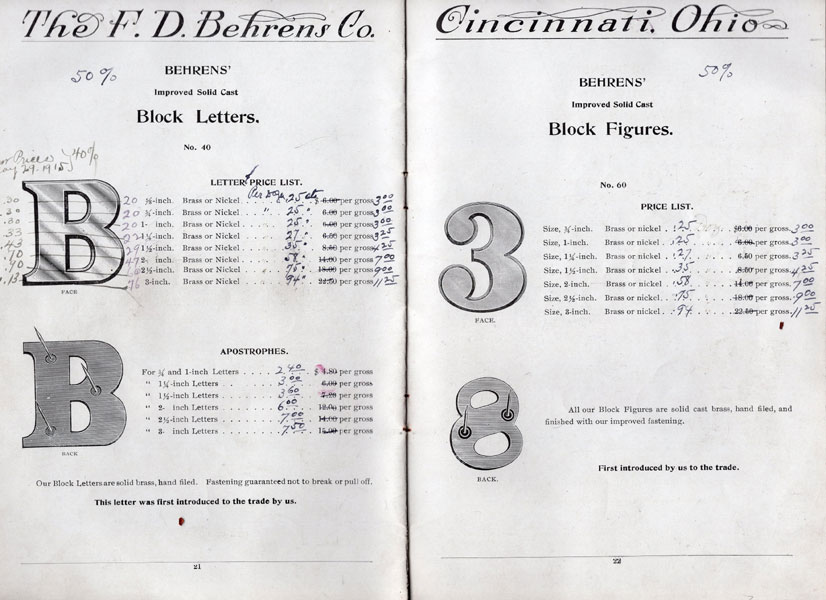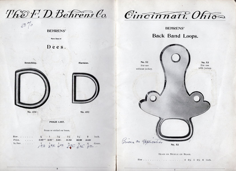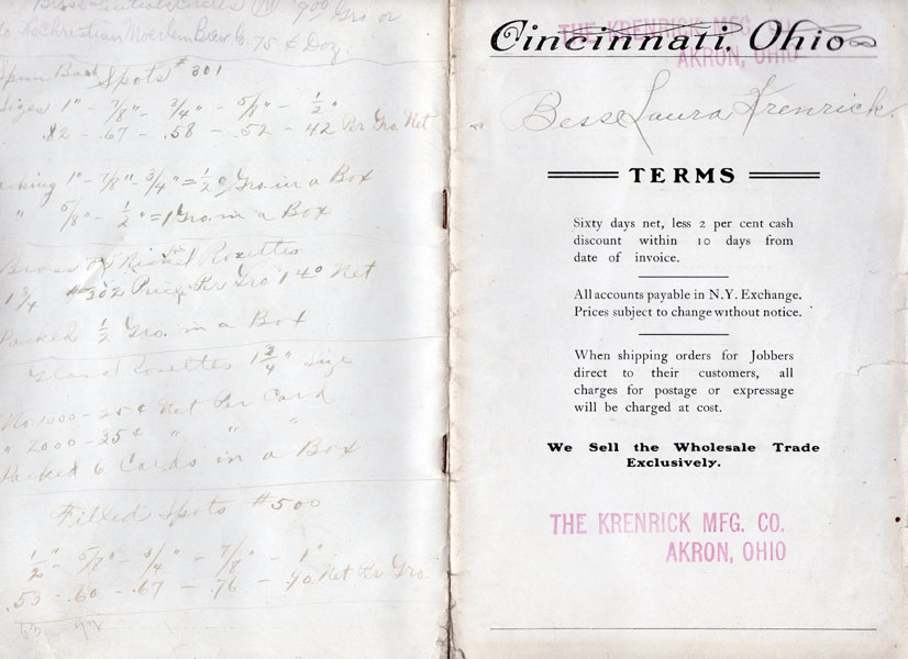 9" x 6" in printed white wrappers. 2-page index followed by 32 pp. showing sizes, illustrations, composition of various rosettes, ornaments, front band, letters, conchas, buckle shields, harness rings, gag swivels, etc. Inserted is a letter from The Krenrick Mfg. Co. stating that effective immediately the prices for listed solid filled spots and spun back spots have increased due to the increase in the price of brass. Most likely an in-office reference for the purchase of various ornaments manufactured by the Krenrick Mfg. Co. in Akron Ohio for the Behrens Company. At top of each page is a percentage, and then beside the price list at the bottom of each page the original typed price is marked through and a hand-written price has been inserted. Rear wrapper has hand-writing, with item, sizes, and pricing. Pages lightly soiled and worn due to use. Front cover stamped at top and bottom with "The Krenrick Mfg. Co., Akron, Ohio." Beneath the top stamp is neatly written "Besse Laura Krenrick." 1" split to toe of spine along with chipping and wear to the extremities. Good.