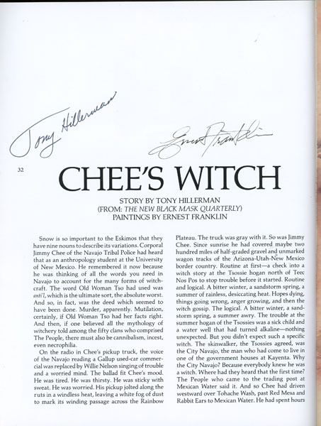 First edition. 4to. Story appears in Native Peoples, Volume 2, Number 1, Fall, 1988. Color pictorial wrappers, 46 [2] pp., story appears on page 32- 39, double column, illustrated by Ernest Franklin, inked signature of Tony Hillerman and Ernest Franklin. Includes this story by Hillerman from The New Black Mask Quarterly" illustrated with paintings by Navajo artist Ernest Franklin. Also includes "Apache Cattlemen" by Michael Moore; "The Wind is Everywhere - A Glimpse into the World of the Apache Crown Dancers" by Paul Ethelbach and Edgar Perry, Jr. Fine copy.