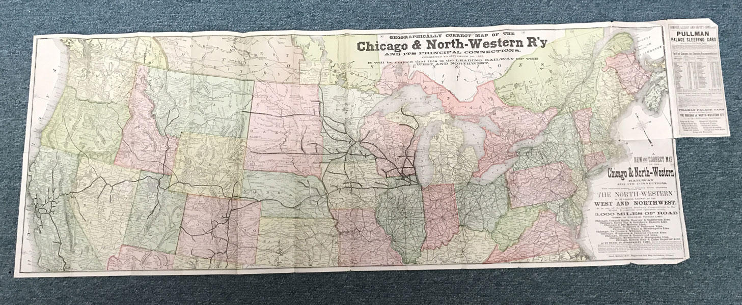 16" x 46 1/2" sheet folded to 50 panels. Printed in red and black. Map. 23 panels of time tables; 1 panel showing tariff of charges for Pullman sleeping accommodations ... Between Chicago and San Francisco cost $17.00; Between Chicago ad Madison cost $1.50; 1 cover panel; 1 panel showing an illustration of the North-Western dining car ... "Only 75 cents for a splendid meal in these cars." Time tables offered for Council Bluffs and Omaha Line; Sioux city & Southern Dakota Line; Chicago, Council Bluffs & California Line; Council Bluffs, Omaha & Denver Line; Chicago, St. Paul & Minneapolis Line,; Minnesota and Central Dakota Line; Huron, Pierre & Deadwood Lines; Janesville, Watertown and Fond Du Lac Line; Rockford, Freeport and Dubuque Line; St. Paul, Minneapolis & Manitoba, Northern Pacific and St. Paul & Duluth Railways; Milwaukee, Green Bay & Marquette Line; Minnesota and Central Dakota Line; Clinton & Anamosa Line; Chicago & North-Western and Milwaukee, Lake Shore & Western Railways; Kenosha and Rockford Line; Dayton & Lake city Line; Eagle Grove & Sioux Rapids Line; etc. Opposite panels offers a 24 panel color system map entitled, "Geographically Correct Map of the Chicago & North-Western R'y and Its Principal Connections. Correct to September 1st, 1881. It Will Be Noticed hat This Is The Leading Railway Of The West And Northwest." A statement at the bottom corner of the map touting that the Chicago & North-Western Railway is one of the largest railway corporations in the world. It controls and operates nearly 3,000 miles of road forming the following lines: Chicago, Council Bluffs, Denver & California Line; Sioux City & Southern Dakota Line; Chicago & Des Moines Line; Chicago, Freeport & Dubuque Line; Chicago, St. Paul & Minneapolis Line; Chicago, La Crosse & Winona Line; Chicago, Minnesota & Central Dakota Line; Chicago, Pierre & deadwood Line; Chicago, Milwaukee & Marquette Line; and Chicago, Green Bay & Lake Superior Line. Map shows all states from the west coast to the east coast and to the south showing upper 2/3ds of California and all of Nevada, Utah, Colorado, Kansas, Missouri, Kentucky and Virginia. 1/2" split to edge at fold along with a couple tiny holes at folds. Very good plus.