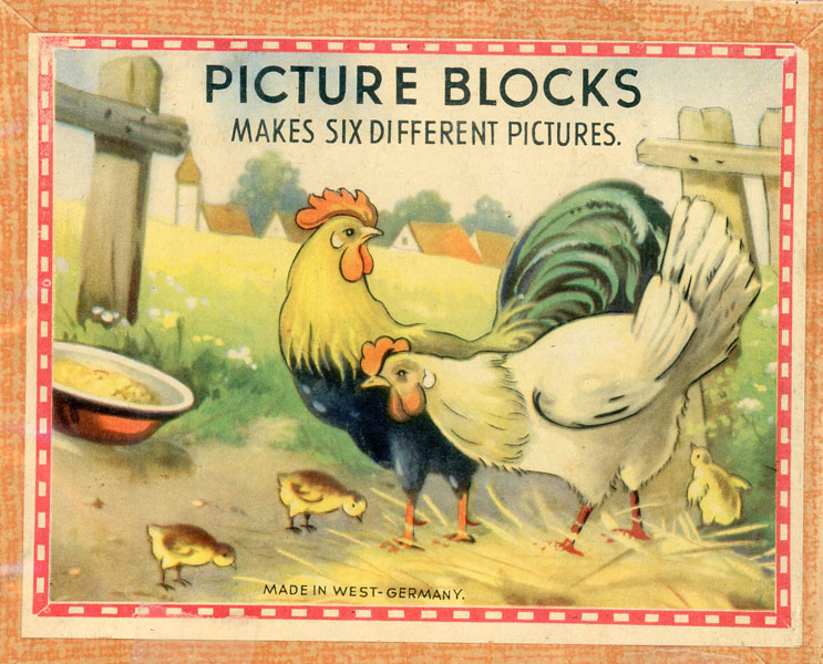 Made in West Germany circa 1955. The blocks are in puzzle form and feature six different animal views. The views are present and in full color, each depicted on a separate sheet and with five depicted and one view affixed to the top of the box. The blocks are housed in a paper over boards 5 1/2" x 4 3/4" x 1 1/2" decorated box with a small catch for locking the box affixed to the fore-edge. The blocks and color pictures are in near fine condition and the decorated box is in very good condition showing a few light signs of wear to the edges of the lid. An unusual item and a clever puzzle.