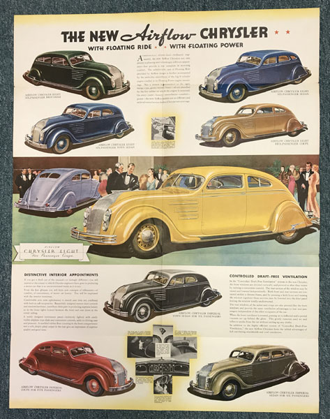 First edition of this beautifully illustrated dealer catalogue promoting the groundbreaking Airflow style Chrysler models for 1934, including 4-door sedan, 2-door Touring Sedan, and designed by Carl Breer. 21" x 27 1/4" color one sheet dealer poster with color promotional details on each side. Folds down to 5 3/4" x 10 1/2" size.The Airflow models also featured the innovative modern streamline styling, with a waterfall grille, semi-flush headlights, the rear wheels encased in fender skirts, and a Vee raked windshield, but it was just too radical a departure for the consumers at the time. To further support their design, Chrysler promoted a new era of transportation identifying the car with streamlined passenger trains, and ultramodern transportation and architecture designs like the Graf Zeppelin and the Chrysler Building in New York City. At the depths of the Great Depression, the car was too advanced, and different for consumers, so in the subsequent years it was substantially redesigned. No copies located in Worldcat. Very good copy.
