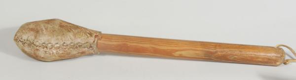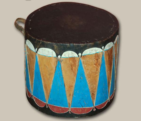 Pueblo dances are prayers. They are sacred occasions where Pueblo people give thanks for a bountiful harvest, good health and prosperity. The singer’s prayer songs are accompanied by the sound of drums. The beat of the drums reminds us of the sound of the heartbeat of mother earth, the source of all life. It could also be the sound of thunder, the signal that life-sustaining rain is on the way. Drums are an integral part of all Pueblo dances, but not all Pueblos make their own drums. The most desired drums are known to come from Cochiti Pueblo where the Herrera family has been making drums for three generations. Santiago “Jim” Herrera (? - 1971) taught his son Arnold to make drums in the 1960s and 70s. After the death of his father in 1971, Arnold continued the drum-making tradition and has now passed this art to his sons. This drum was made by Santiago Herrera. It was carefully carved out of cottonwood and decorated with a royal blue paint that contrasts with the natural color and grain of the cottonwood. The stretched rawhide covers a white band on one side and a red band on the other. The drum head is painted black and there are signs of use in the middle of the head. In addition to the drum, a beater is included. The beater has a top of sewn rawhide with stuffing inside. The drum size is 18" height x 19" diameter. The drum has two heads. Pueblo songs are written to start slowly and then go to a climax. At a certain point of the song, the drum is flipped over to achieve a higher beat. This lifts the dancers and gives them the impetus to continue dancing. Condition: The drum is in excellent condition, the rawhide head and the strings are very tight.