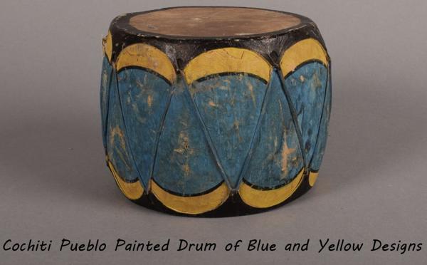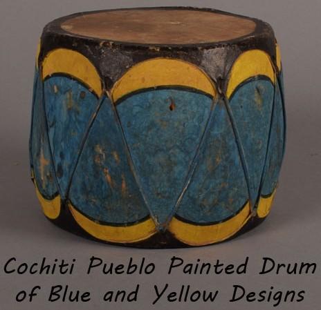 This Cochiti Pueblo wooden drum has a beautiful bulge on the sides which are painted blue and yellow, separated by a black arched line and is 5 1/4" tall x 6 1/4" diameter. The edges of the drum heads are painted black, with the center left unpainted. The drum came from Cochiti Pueblo, New Mexico. Pueblo dances are prayers. They are sacred occasions where Pueblo people give thanks for a bountiful harvest, good health and prosperity. The singer's prayer songs are accompanied by the sound of drums. The beat of the drums reminds us of the sound of the heartbeat of mother earth, the source of all life. It could also be the sound of thunder, the signal that life-sustaining rain is on the way. Drums are an integral part of all Pueblo dances, but not all Pueblos make their own drums. The most desired drums are known to come from Cochiti Pueblo where the Herrera family has been making drums for three generations. Santiago â Jimâ Herrera (? - 1971) taught his son Arnold to make drums in the 1960s and 70s. After the death of his father in 1971, Arnold continued the drum-making tradition and has now passed this art to his sons. This drum could have been made by a member of the Herrera family but we do not know the artisan who carved this drum. It was carefully carved out of cottonwood The drum has two heads. Pueblo songs are written to start slowly and then go to a climax. At a certain point of the song, the drum is flipped over to achieve a higher beat. This lifts the dancers and gives them the impetus to continue dancing. Condition: The drum is in excellent condition, the rawhide head and the strings are very tight.