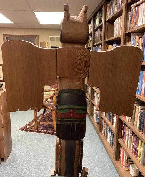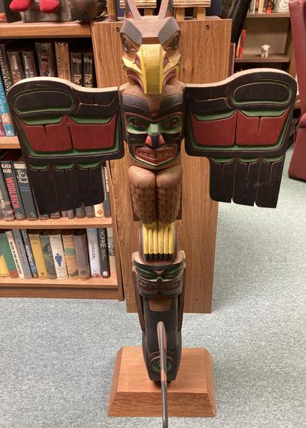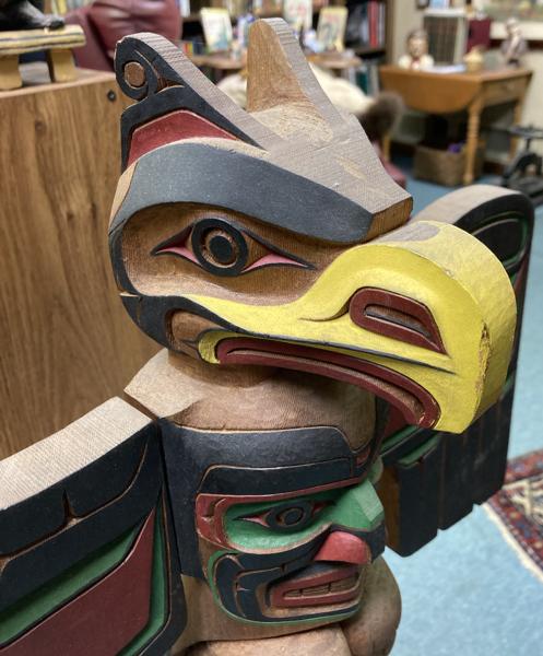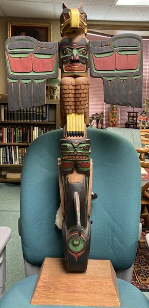 A striking and colorful totem of two carved figures, with an eagle or Thunderbird portrayed as a man at the top with spread wings symbolizing balance. A whale with front facing fin at the bottom symbolizing strength. The initials of the carver "AJ" are under one of the wings. Carved from cedar 38" tall and a 17 1/2" wingspan. Colorful and attractive in fine condition.