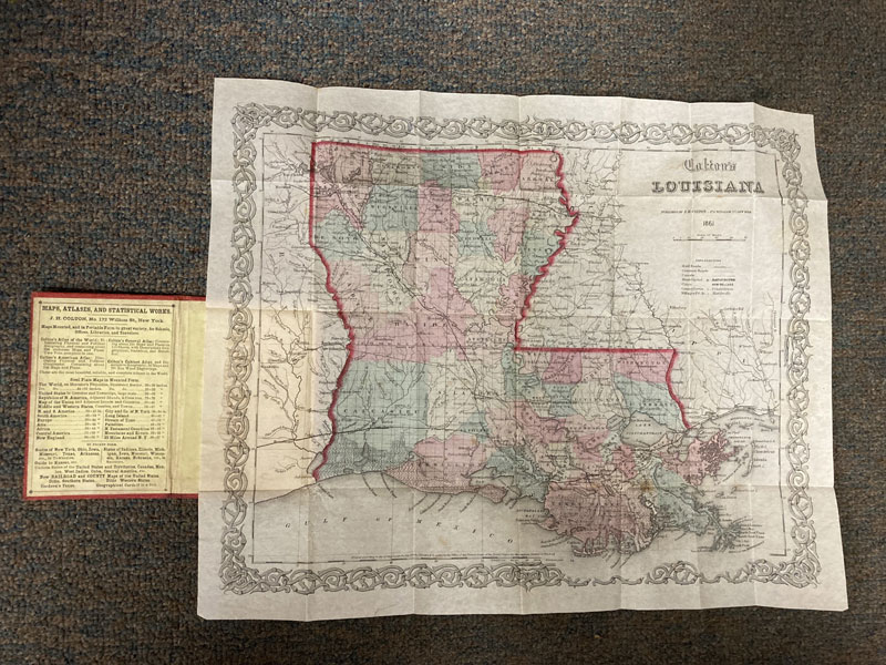 Folding map, 32 x 40 cm [12 5/8" x 15 3/4"] bound-into original decoratively embossed red cloth boards with title stamped in gilt on the front cover. An extremely attractive map of the State of Louisiana as it appeared in 1861. While the map was published in 1861, it is printed at the bottom edge: "Entered according to Act of Congress in the Year 1855." The map is quite detailed, showing individual counties and townships, though townships are not named. Counties are hand-colored in shades of green, yellow, pink, and orange. State boundaries are highlighted in bright pink. Bodies of water are located and named such as Lake Ponchartrain, the Mississippi Sound, the Lau Breton Sound, the Gulf of Mexico, and the Mississippi River. The legend, placed on the right-hand side of the map, explains markings for railroads, common roads, canals, the State Capital (Baton Rouge), the City of New Orleans, other cities and towns such as Franklinton, and Villages and P. O. Boxes. The western portion of Mississippi and the eastern portion of Texas are named. Original hand-coloring, mild foxing, miniscule separations at a few folds, decorative border with edges and corners crisp with no chips, else a near fine, bright copy. Not in Phillips.