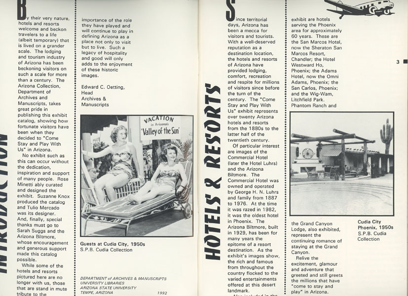 First edition. 8vo. Pictorial stiff wrappers, 21 [3] pp., (including covers), illustrated from photographs. Photographs associated with Arizona hotels and resorts, 1880's to 1950's. Fine copy.