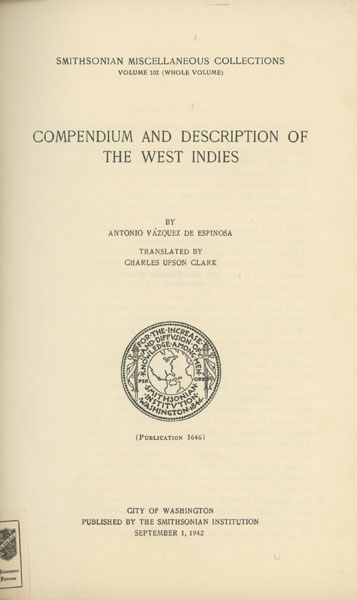 First edition. Large 8vo. 862 pp. Translated by Charles Upson Clark. Smithsonian Miscellaneous Collections, Vol. 102. Beautifully bound in blue leather with gilt illustration on the front cover; gilt ruling; gilt lettering to spine; gilt dentelles; top edge gilt; marbled endpapers. Antonio Vazquez de Espinosa (d. 1630) was a Spanish Carmelite friar who abandoned his academic ambitions in order to serve as a priest in the Americas. His manuscript of 1628 was a "lost" manuscript until translator Clark found it in the Barberini collection in the Vatican. Spending the years from 1610 to 1622 in the Indies, this compendium details descriptions of the people, products, history and administration of the whole Spanish empire from Mexico to Chile, not omitting the Philippine Islands or Paraguay ... most of these places he visited himself , and he frequently closes his chapters with the statement that 'all of this I verified with my own eyes when I was in that country.' Vazquez evidently had access to contemporary administrative and military archives, for long tables of valuable data are given. If one wants to know the weight diameter, size of ball, and powder required for each of the forty-three cannons guarding Morro Castle in Havana, or the salaries of each of the royal officials in Chile, from captain in the army to caulker in the royal navy, or the number of Indians in each curacy of Yucatan in 1609, Vazquez gives the answer." Part I deals with New Spain (Mexico, the colonies in the Indies and Florida) while Part II relates to South America, including the Spanish Main. Much on geography, natural history, mining, agriculture, public administration and Church institutions. Minor wear to extremities; else a fine, bright copy.