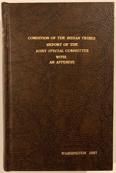 First Edition. Rebound in simulated leather with titles in gilt on spine and front panel. 532pp. Numerous charts & tables. Senate Report 39th Congress, 2nd Session. Report No. 156. Volume includes Reports Nos. 141-178. "Lurid details of Chivington's sickening massacre of unoffending Indians at Sand Creek, Colorado."-- Howes C-665. Field 354, with a lengthy annotation to this report: "This volume contains the evidence of the horrible massacre of unoffending Indians at Sand Creek. The atrocities that were perpetrated upon the bodies of the slain would tax the cleverest ingenuity of devils to invent its parallel. Every one of the dead was scalped ... The genitals of both sexes were cut off. The skins of the males were dried for tobacco-pouches, and those of the genitals of the women were worn as hatbands ...To the truth of these statements we so unwillingly believe, nearly one hundred witnesses testified before a committee of Congress, and their examinations are recorded in this volume." The section on Sand Creek (pp.26-98) is titled "The Chivington Massacre." This report, also known as the Doolittle Report (after its chairman, Senator James R. Doolittle, of Wisconsin), has much information on Indian affairs throughout the West. Jack Rittenhouse calls this book, "One of the most generally useful Congressional documents on Indian affairs along the Santa Fe Trail ... there being long depositions, including opinions by Kit Carson, William Bent, and others ...The report's largest section, "Letters Relating to Indian Affairs in the Department of New Mexico During the Years 1862 and 1863" (pp. 98-362), documents the brutal treatment of the Navajos by Gen. James H. Carleton". An important volume recording much detail regarding military interaction with multiple western Indian tribes. Small pencil notations in the margins of several sections pertaining to the Navajos, Kit Carson, and/or General Carleton. New endpapers. Else a clean copy with no foxing.
